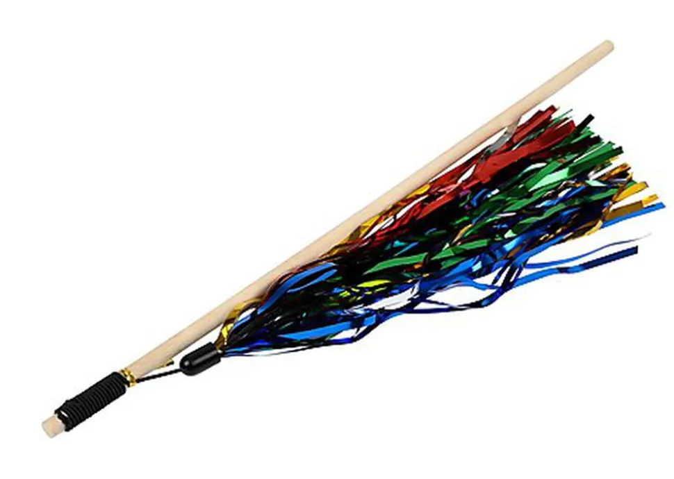 Jouet canne à pêche pompomgirl, avec ornements colorés, qui sucite l’attention du chat, avec manche en bois naturel et franges en plastique à l’extrémité.