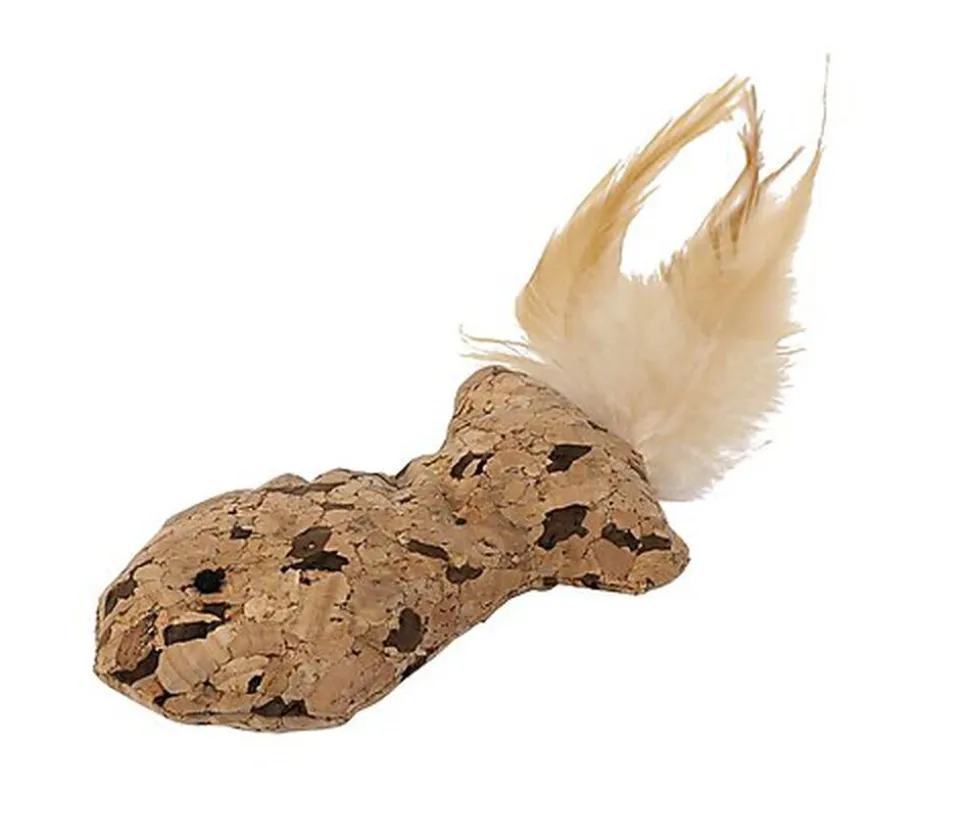 Jouet pour chat en forme de poisson en liège avec plumes, pour de longues heures de jeu.