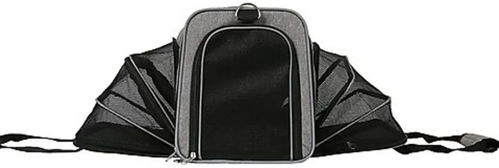 Sac Camping spécialement conçu pour le confort des chiens, lorsqu’il est déplié, il offre un large espace sécurisé. Le sac Camping avec bandes réfléchissantes est idéal pour transporter votre animal. Un astucieux système d’extension sur les côtés, permet à ce sac de pratiquement tripler sa surface, permettant à votre animal un gain de place supplémentaire. Compatible avec les animaux de moins de 7 kilos.