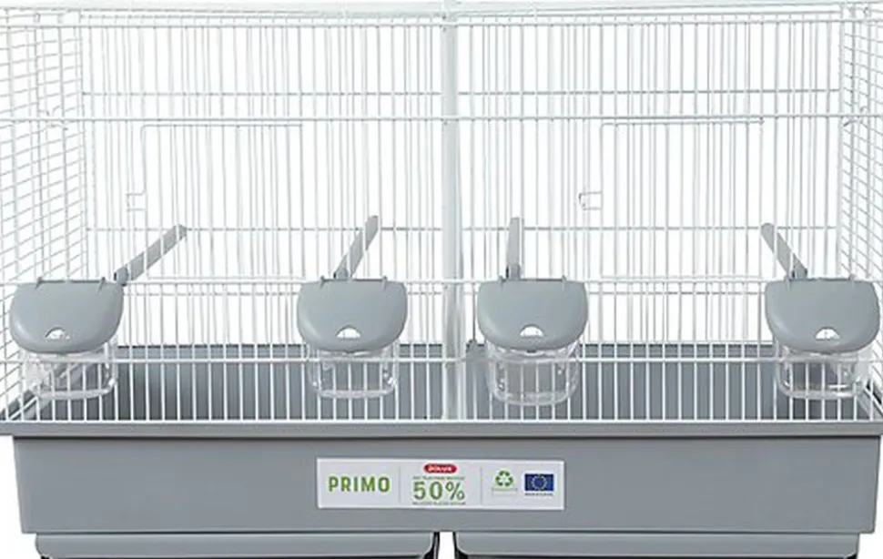 Nouvelle cage éco-conçue PRIMO Cati pour oiseaux domestiques avec bac en plastique 50% recyclé, elle s’intègrera facilement dans les intérieurs grâce à ses coloris classiques et actuels gris clair et blanc.