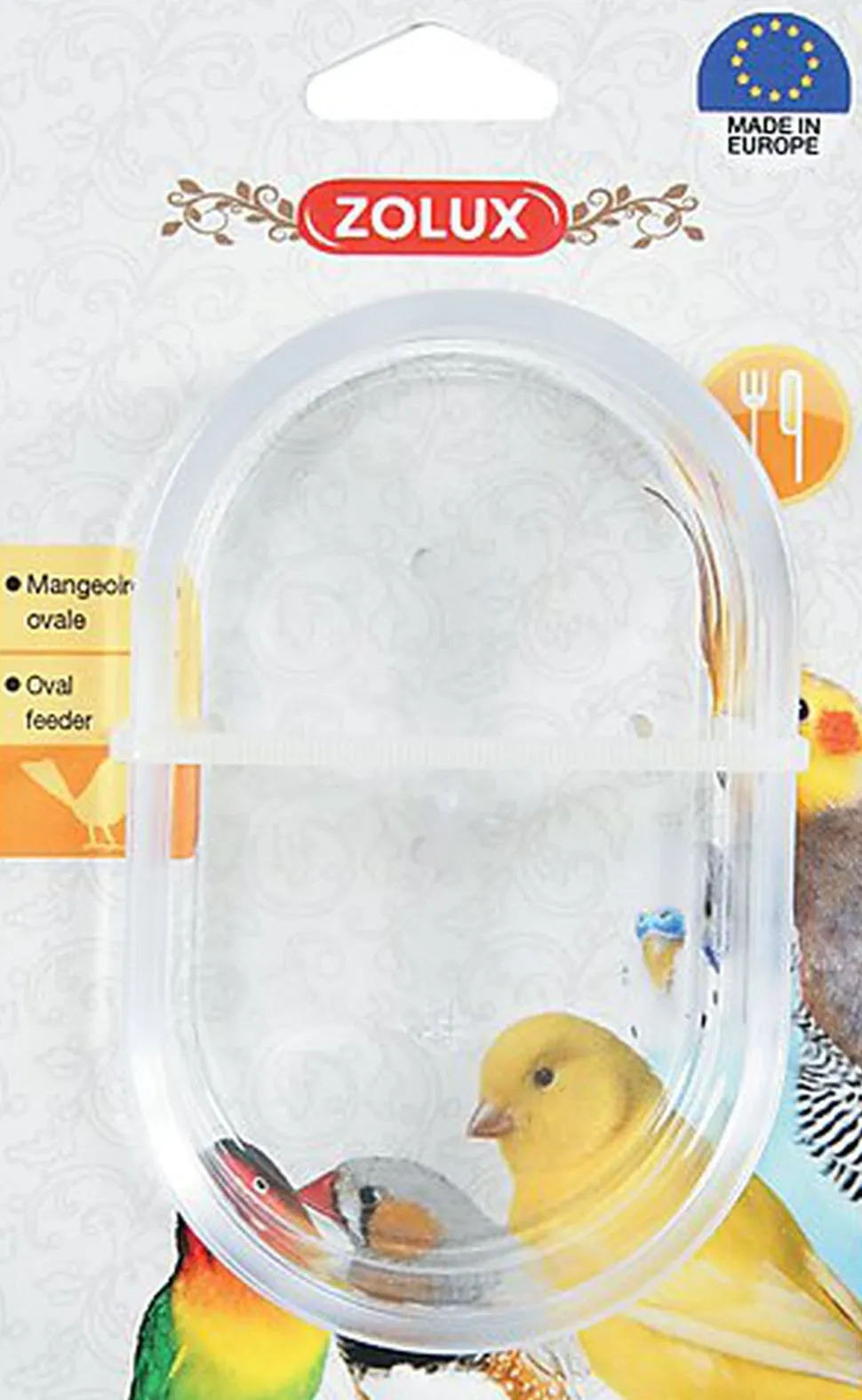 Mangeoire ovale transparente à poser au sol, pour tous types d’oiseaux.