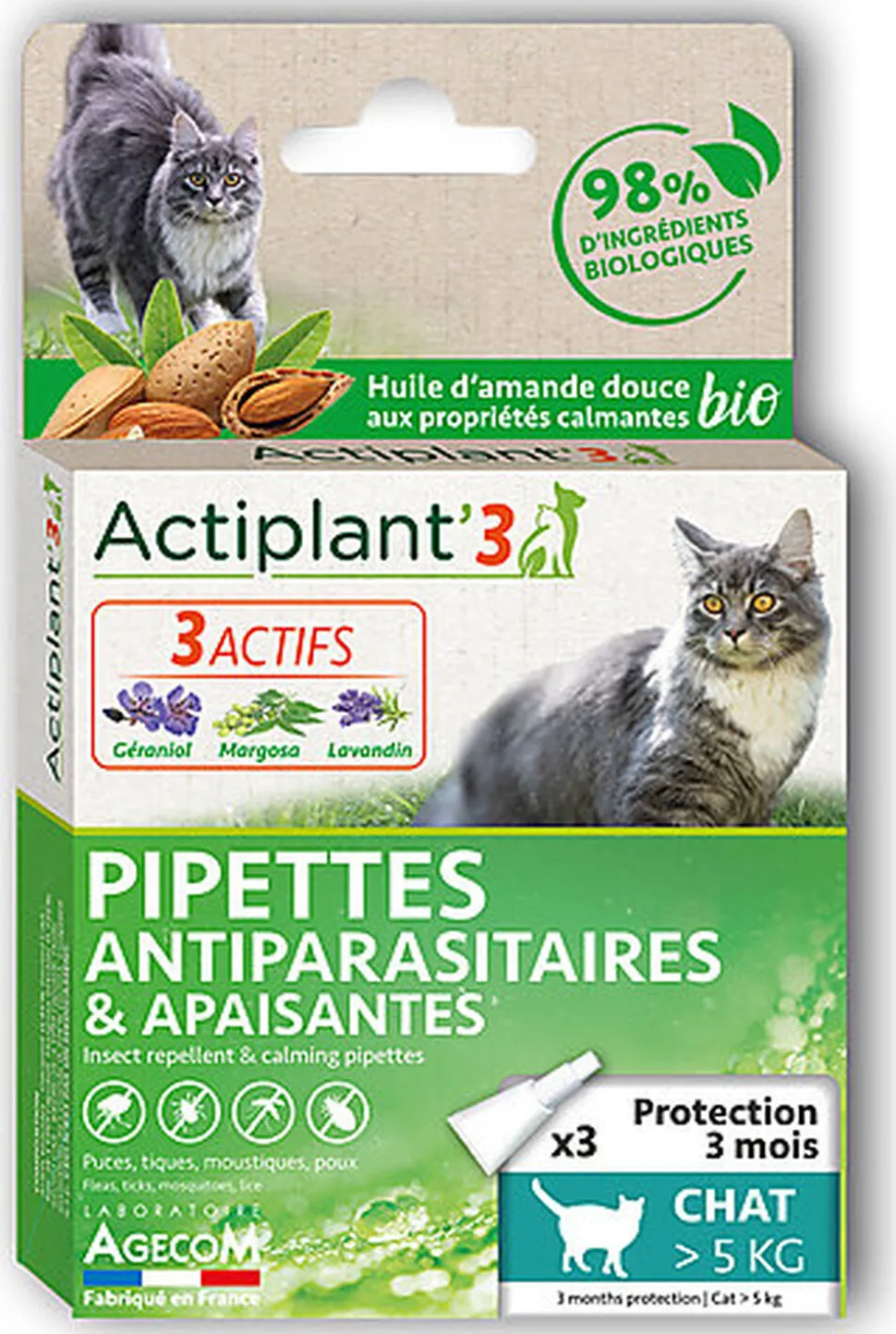 Propriétés : La pipette insectifuge et calmante Actiplant’3 a été spécialement formulée à partir de substances actives inspirées du monde végétal et reconnues pour leurs propriétés répulsives : Géraniol, Margosa, Lavandin. Chaque substance a une action spécifique sur les parasites externes (puces, tiques, moustiques et poux). La combinaison de ces principes actifs associés dans une même formule crée un véritable booster et permet une action renforcée sur les parasites.