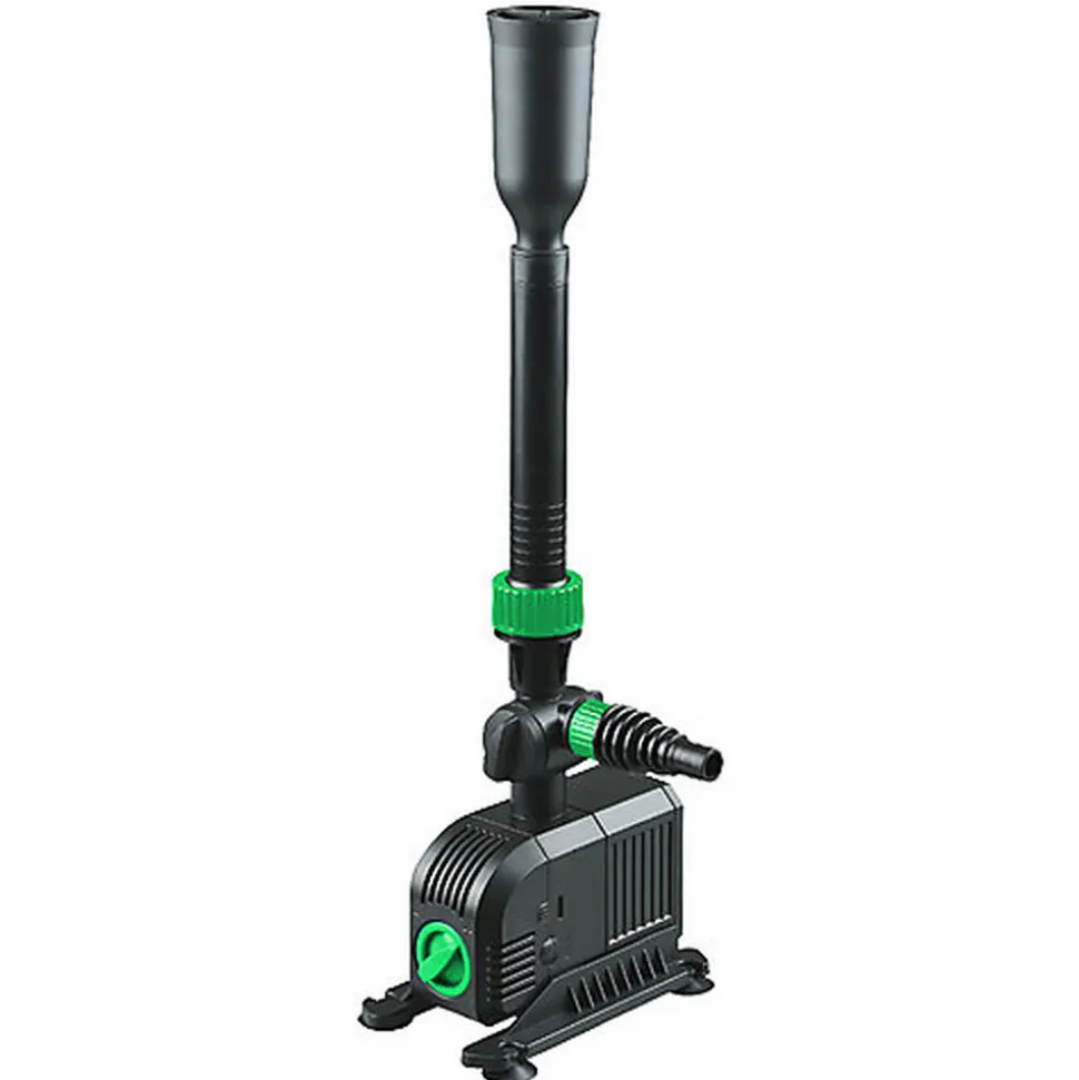 Pompe compacte idéale pour les petits lacs (« Bonsai Pond ») et les fontaines, avec un débit d’eau réglable. Grâce au robinet spécial, il est possible d’acheminer et de réguler le débit soit vers le jeu d’eau fourni, soit vers une conduite à laquelle il sera possible de raccorder un filtre externe ou avec laquelle il sera possible de créer une chute d’eau.