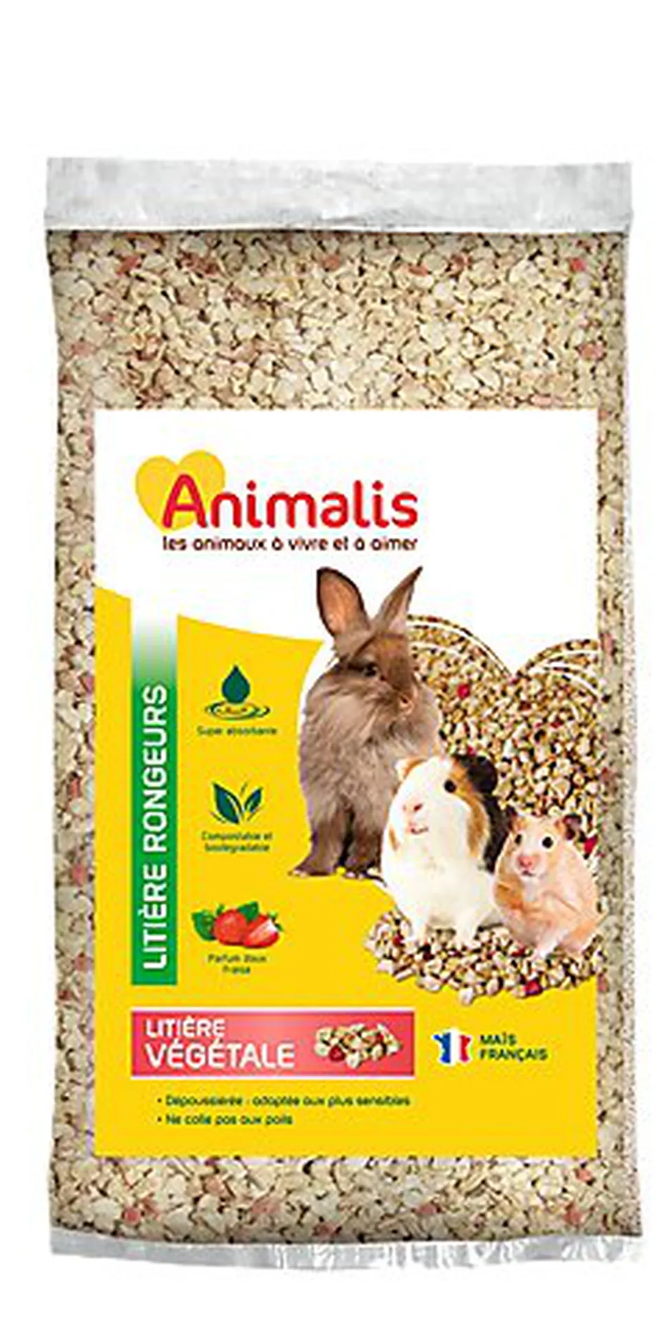 Litière à base de rafle de maïs français, parfumée à la fraise, très absorbante et non poussiéreuse pour tous les petits mammifères de compagnie.