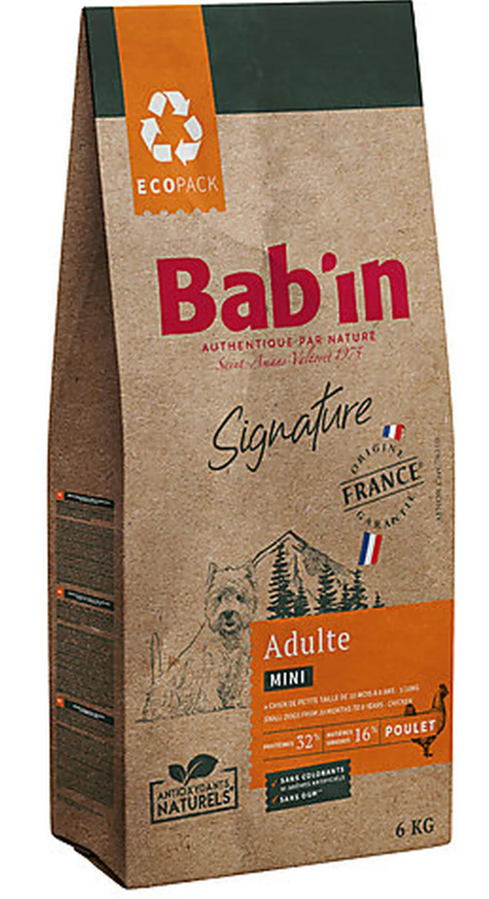 BAB’IN MINI ADULTE présente une croquette de taille et texture adaptées à la morphologie des chiens adultes de petite taille. Il répond aux appétits difficiles grâce à une excellente appétence et favorise un pelage brillant et une peau saine (oméga 3&6, acides aminés soufrés, vitamines). Contient un complexe de prébiotiques et des protecteurs articulaires.