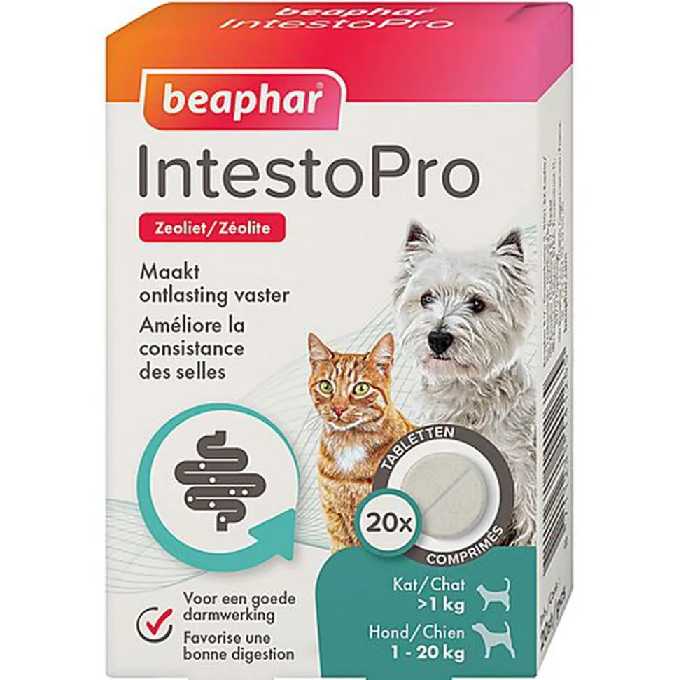 Aliment complémentaire pour chats et petits chiens.IntestoPro de Beaphar aide à soulager les troubles gastro-intestinaux des chats et des chiens dès l’âge de 8 semaines et à partir de 1 kg de poids corporel.Le principal ingrédient – la zéolite – est naturel et aide à rendre les selles plus épaisses en absorbant l’excès d’humidité. Le produit contient également des FOS et MOS, qui sont connus pour leurs vertus. Ils favorisent un fonctionnement normal du système intestinal et aident au renforcement de la flore intestinale.IntestoPro est particulièrement recommandé pour les chats et pour les chiens qui ont des selles variables ou liquides et peut également être utilisé pour les femelles gestantes et allaitantes.