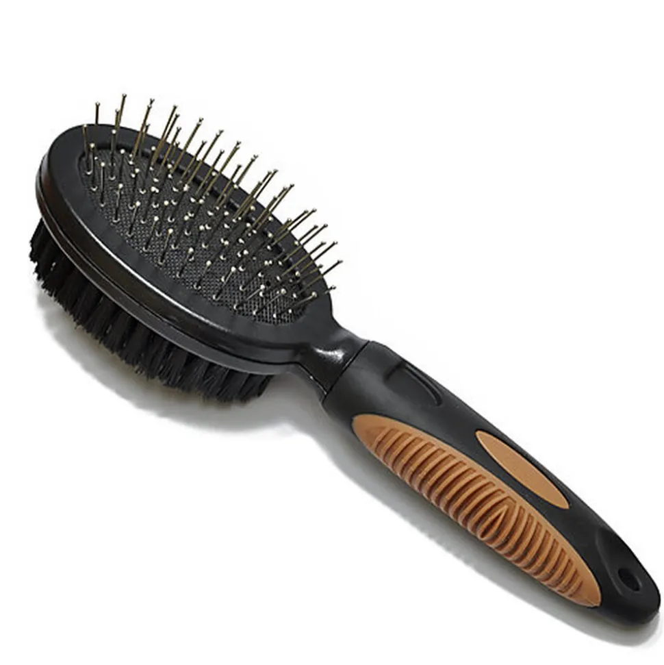 Cette brosse 2 en 1 est idéale pour les chiens moyens et grands à poils mi-longs/longs/épais. Elle est dotée d’une face à picots arrondis en acier inoxydable pour démêler les nœuds tout en massant en douceur et d’une face souple pour retirer les poils morts et faire briller le pelage.