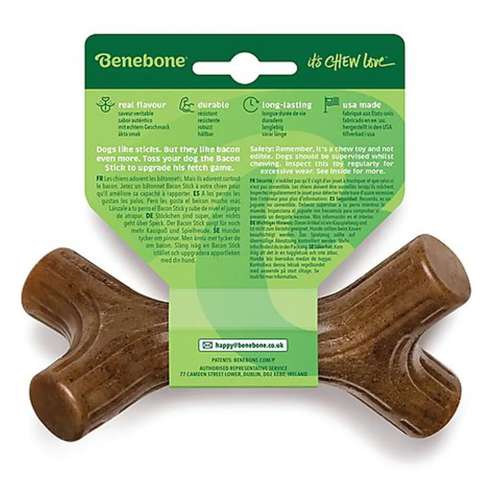 Les accidents causés par les bâtons sont très nombreux : un réel dilemme pour les chiens qui adorent ramasser et mastiquer les bouts de bois. Benebone à conçu cet os en forme de bâton pour permettre au chien de jouer sans risque d’accident ou de petites blessures liées aux échardes.
