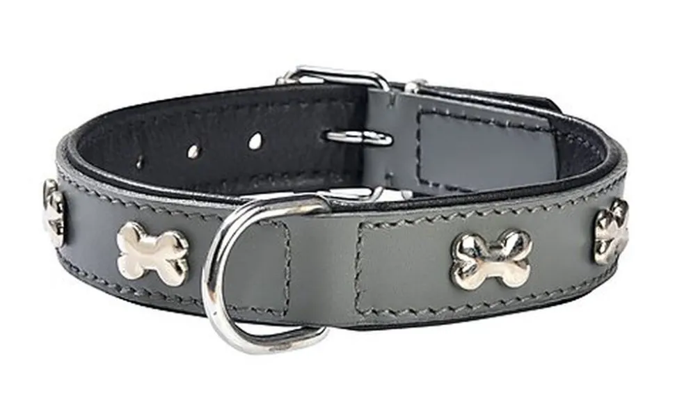 Collier en cuir extra souple, ornet de rivets « os », pour chien, et d’une belle bouclerie et surpiqûres contrastées.