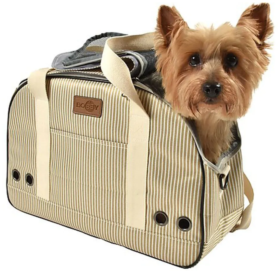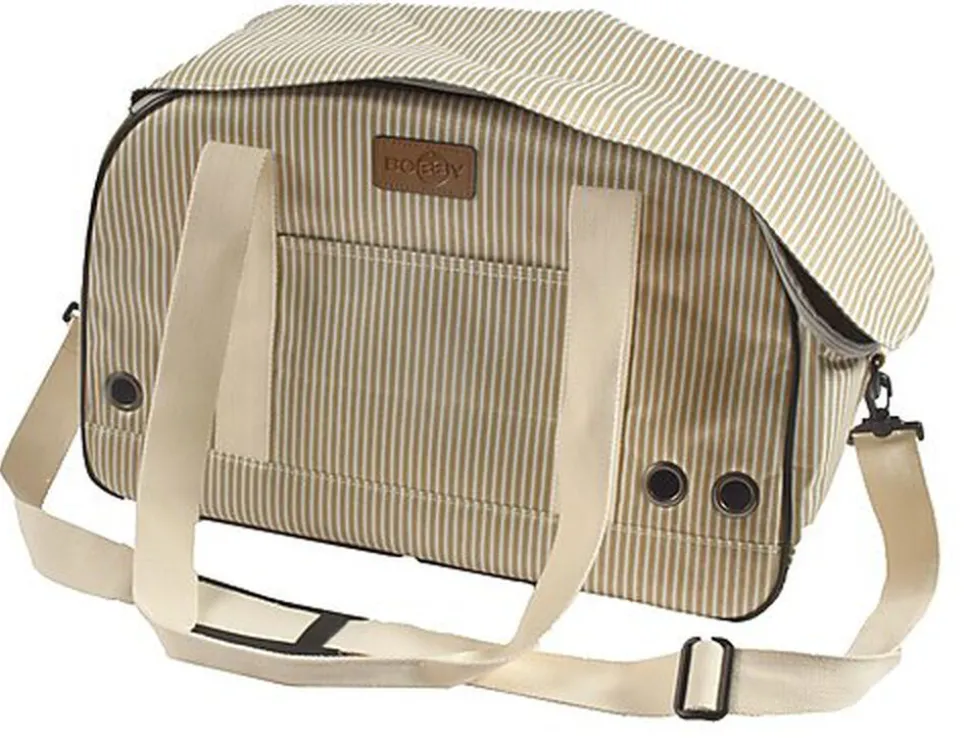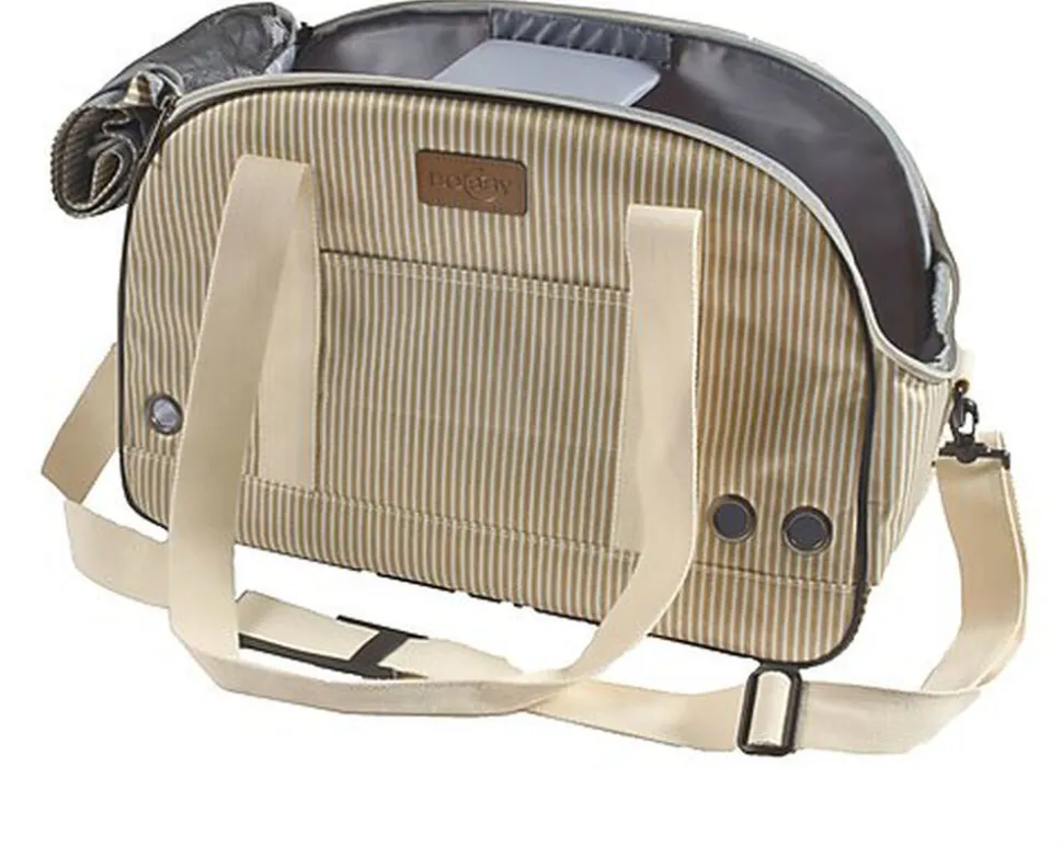 Joli sac de transport confortable et pratique avec rayures tennis raffinées et patch fantaisie similicuir. Disponible en marine et en beige pour chats et petits chiens.