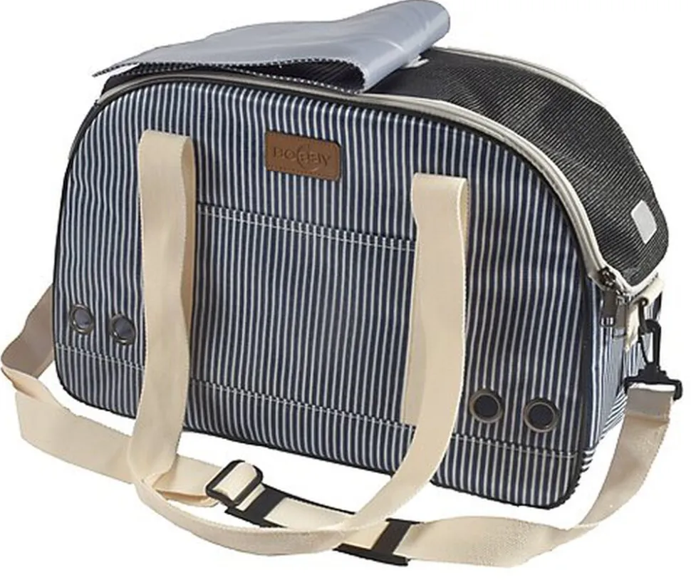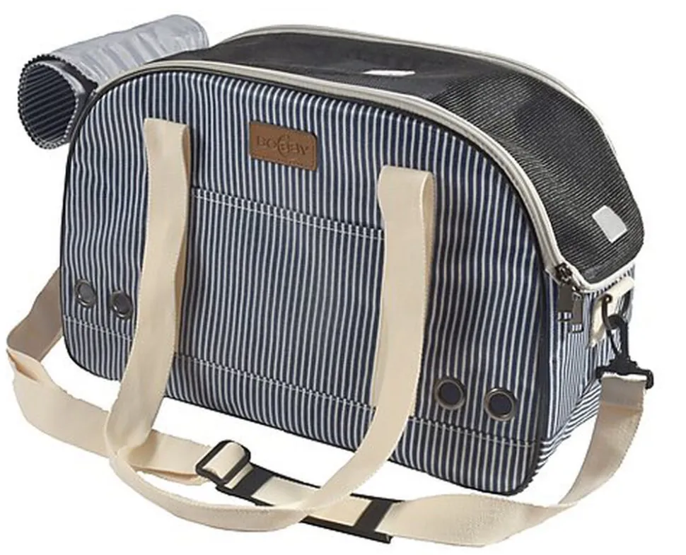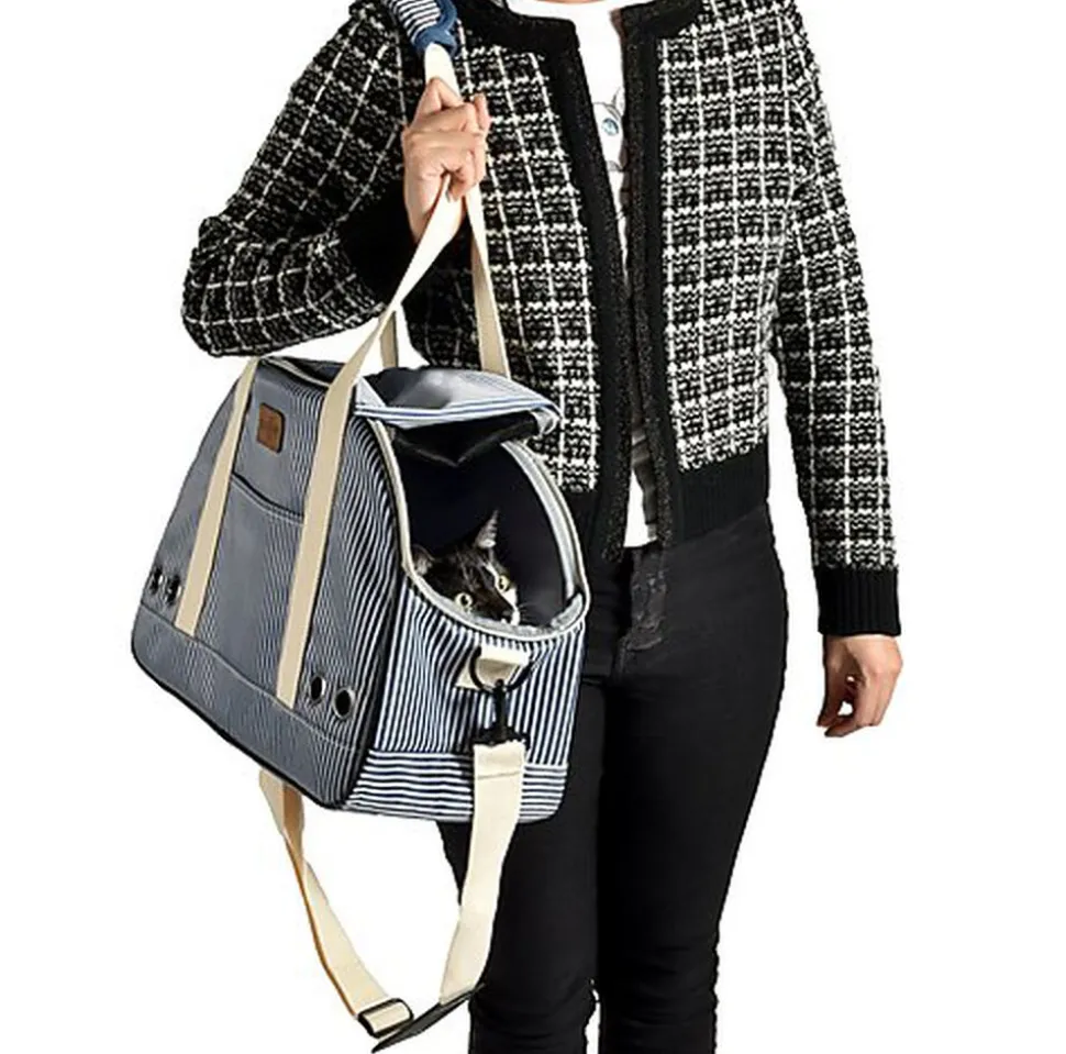Joli sac de transport confortable et pratique avec rayures tennis raffinées et patch fantaisie similicuir. Disponible en marine et en beige pour chats et petits chiens.