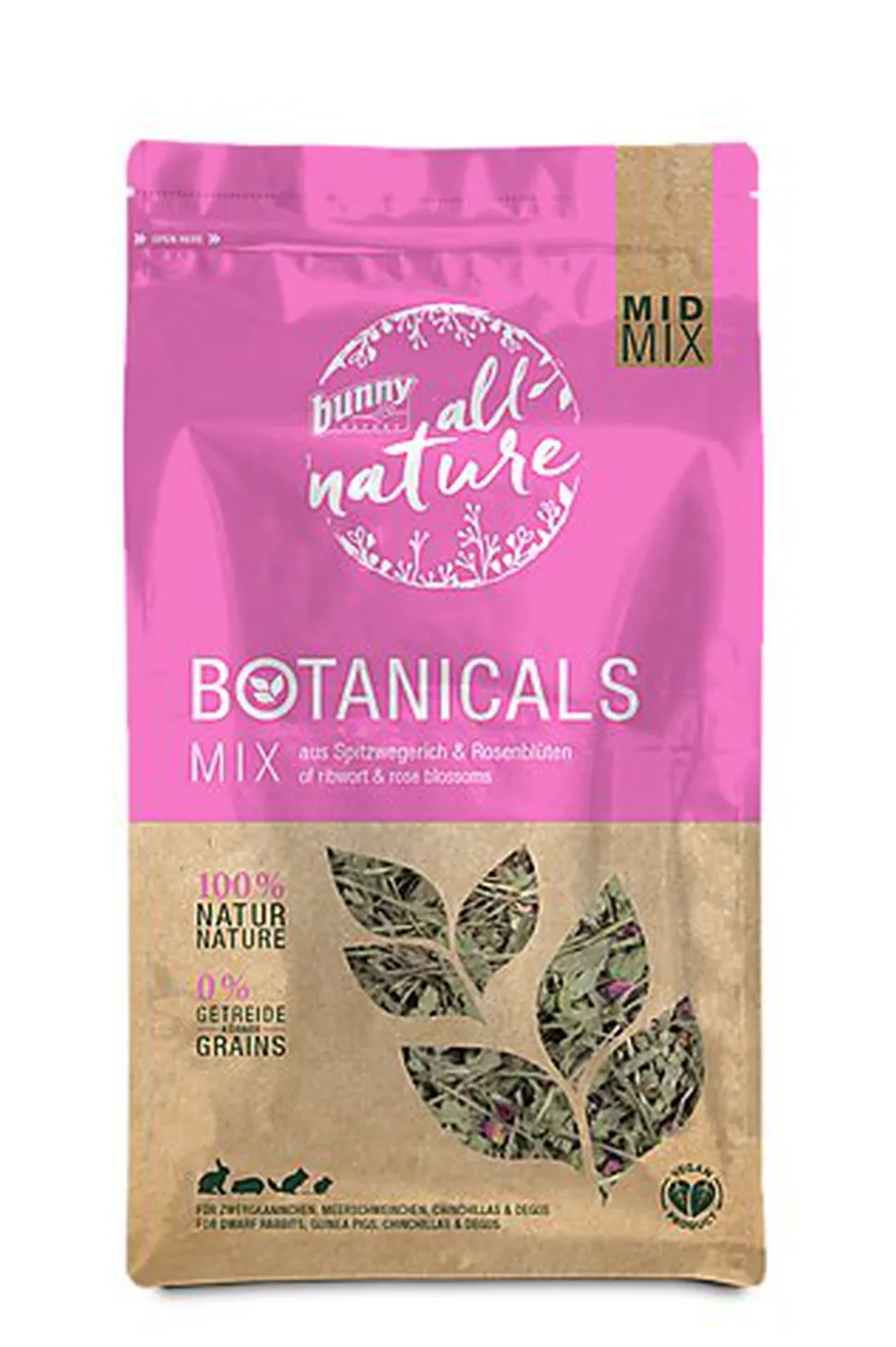Aliment complémentaire au plantain lancéolé et fleurs de rose pour lapins nains, cochons d’Inde, chinchillas et octodons.
