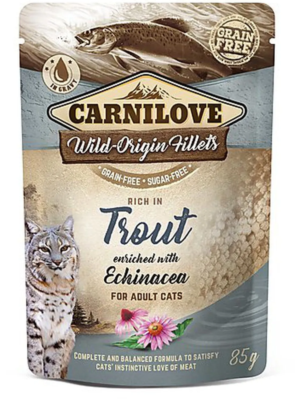 | Composition | Composition : viande en filets 85 % (dont 71 % de poulet, 14 % de truite), bouillon 12 %, échinacée 1 %, huile de lin 1 %, minéraux 0,5 %, amidon végétal 0,5 %. |