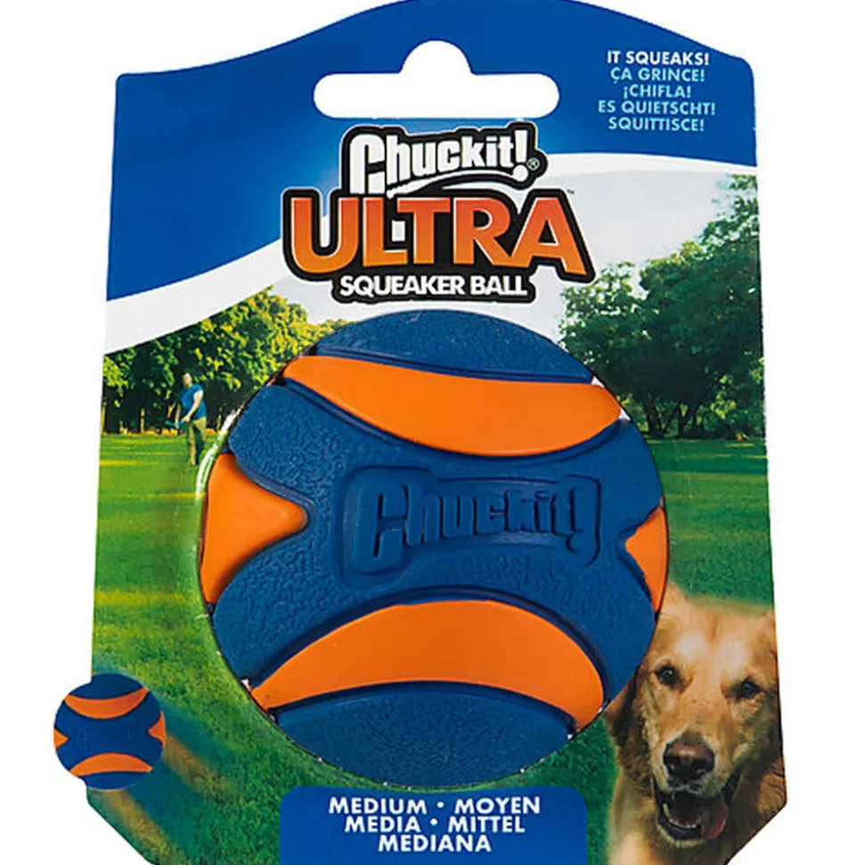 Une balle Chuckit!® Ultra Squeaker rendra certainement le temps de jeu plus agréable pour vous et votre animal de compagnie ! Notre toute première balle couinante incite à jouer avec des sons amusants et un rebond élevé. La surface texturée aide votre chien à avoir une prise plus facile et la construction en caoutchouc durable est facile à nettoyer. Idéal pour les chiens qui aiment aussi jouer dans l’eau, ce qui la rend parfaite pour la piscine les lacs ou la mer. L’Ultra Squeaker Ball est compatible avec nos lanceurs Chuckit!. Disponible en quatre tailles : petite ; moyen; grand; et extra-large. Ici en taille Medium.
