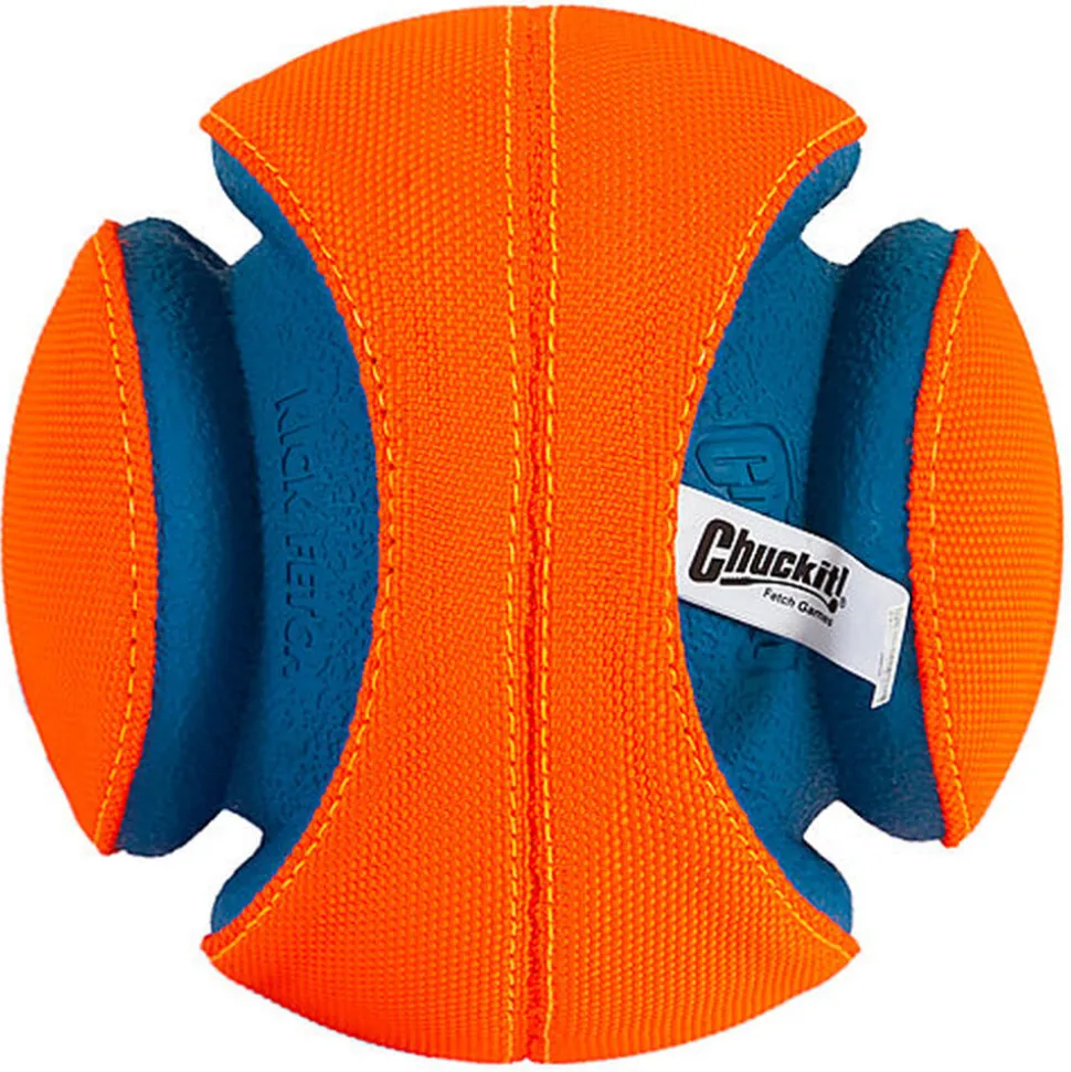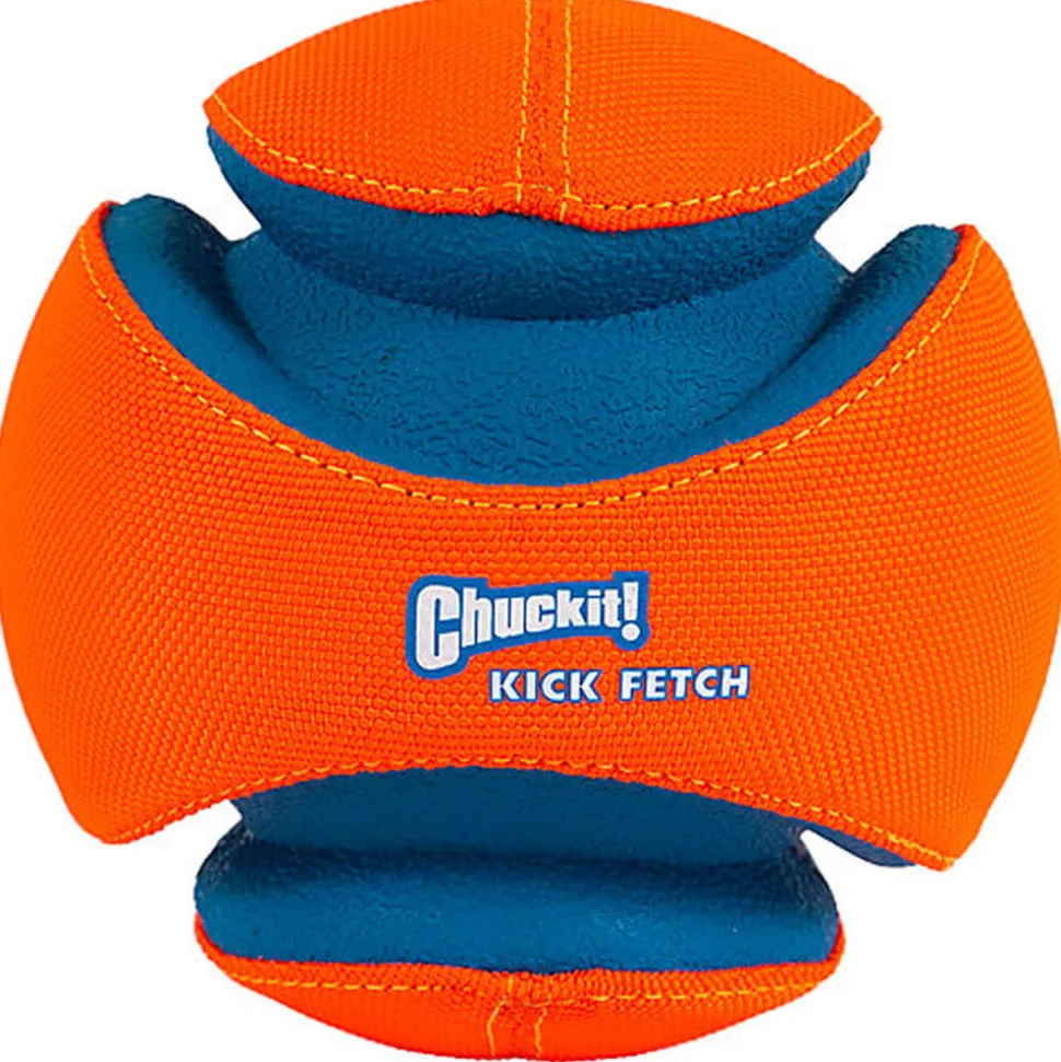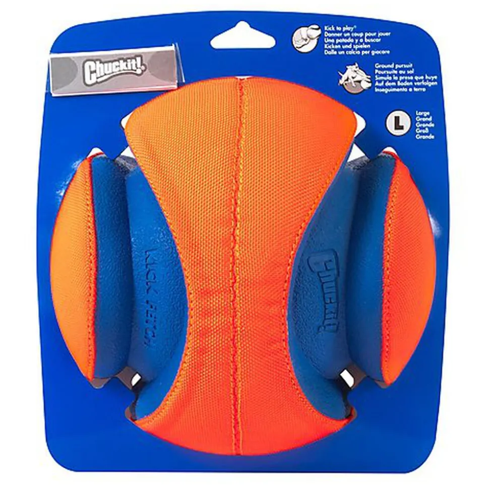 Le ballon Chuckit!® Kick Fetch ! est fabriqué avec de la mousse durable recouverte de tissu en polyester; Quand le chien va le chercher il est specialement concu pour qu’il puisse le ramasser et de le rapporter facilement.