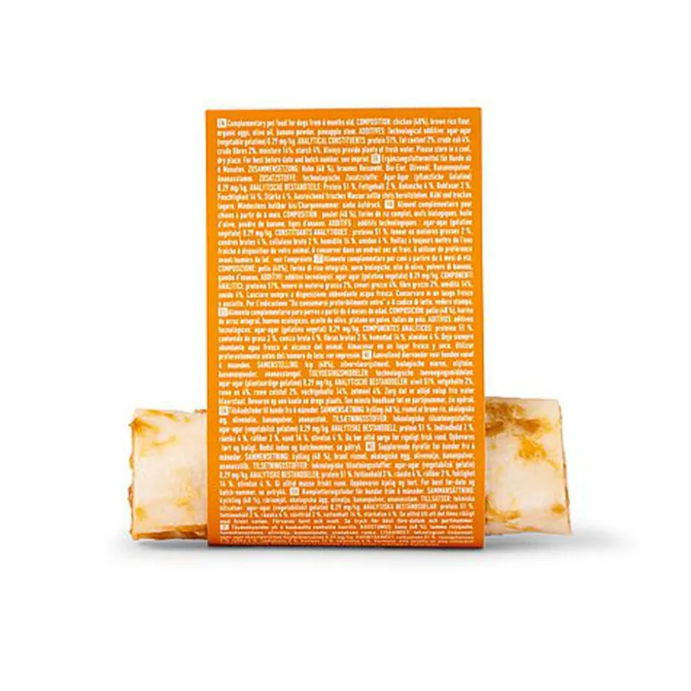 | Additifs nutritionnels | INGRÉDIENTS : poulet (48 %),farine de riz complet, œufs biologiques, huile d’olive, poudre de banane, tiges d’ananas. ADDITIFS : additifs technologiques : agar-agar (gélatine végétale) 0,29 mg/kg.CONSTITUANTS ANALYTIQUES : protéine 51 %, teneur en matières grasses 2 %, cendres brutes 4 %, cellulose brute 2 %, humidité 14 %, amidon 4 %. |