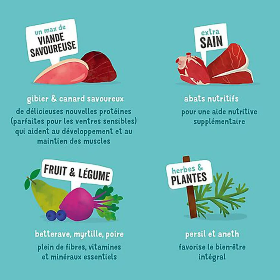 | Composition | Gibier 30 %, canard 26 %, minéraux, carottes 2 %, patates douces 1 %, betterave 1 %, canneberges 1 %, pommes 1 %, persil 0,1 %, aneth 0,1 % |