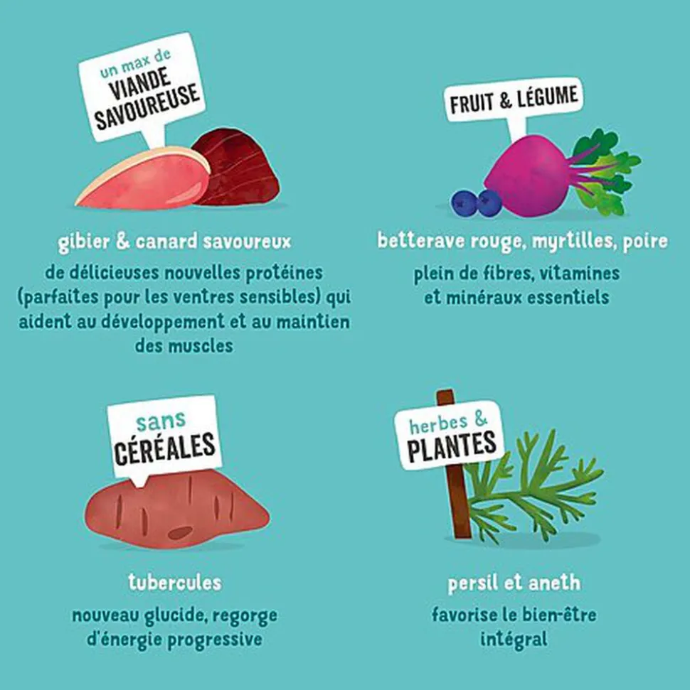 | Composition | Gibier 37 %, canard 30 %, patates douces 2 %, betterave rouge 2 %, minéraux, pommes 0,5 %, manno-oligosaccharides (MOS), huile de lin 0,25 %, poires 0,2 %, fructo-oligosaccharides (FOS), airelles rouges 0,15 %, myrtilles 0,15 %, ortie séchée, fenouil séché, carvi séché, herbe de millefeuille séchée, feuilles de mûrier séchées, gui séché, fleurs de camomille séchées, racine de gentiane séchée, centaurée séchée |