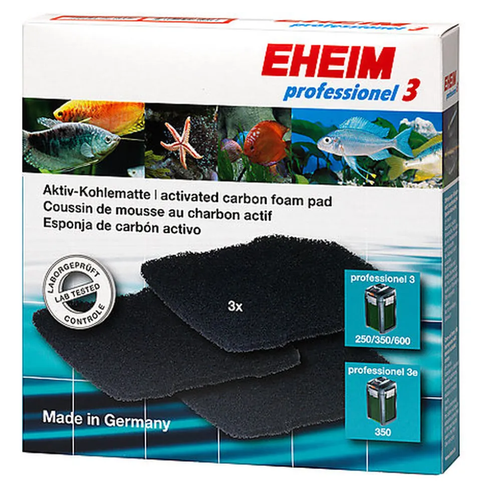 Mousse de filtration EHEIM au charbon, adaptée aux filtres Eheim Professionel 3 : 250 (2071), 350 (2073), 350e (2074), 600 (2075) et thermofiltres 2171 et 2173; et aux filtres Professionel 4+ : 250 (2271), 350 (2273) et 600 (2275).