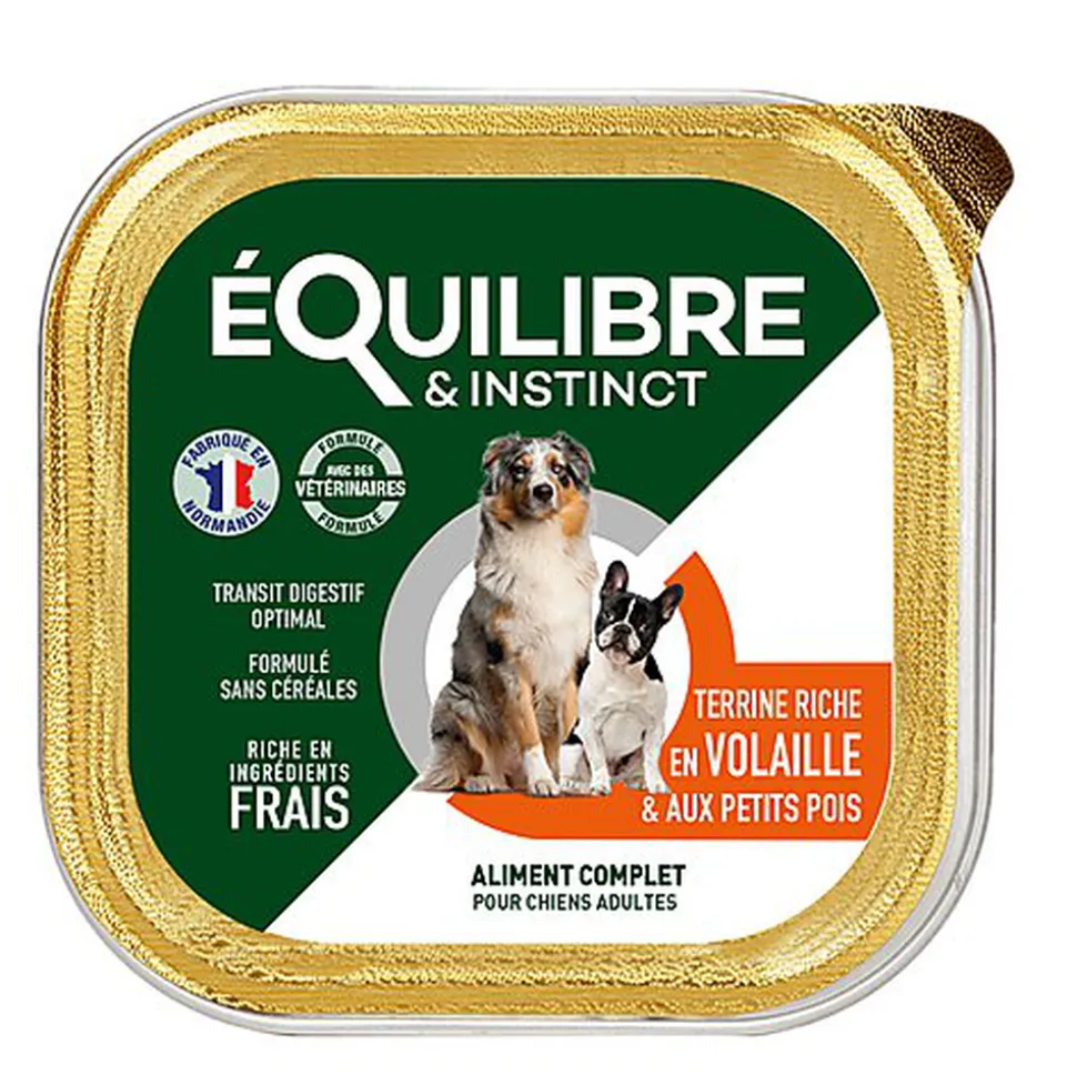 Les pâtées Equilibre & Instinct riches en volaille fraîche et aux petits pois pour chien adulte garantissent une hydratation optimale à votre animal.