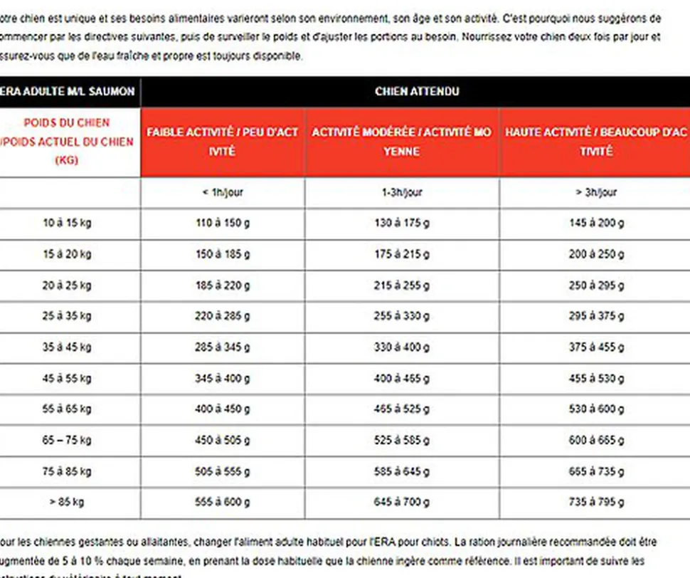 | Constituants analytiques | Protéines brutes 29 % ; Matières grasses brutes 15 % ; Fibres brutes 3 % ; Cendres brutes 8,2 % ; Humidité 10 % ; Calcium 1,3 % ; Phosphore 1 % ; Sodium 0,4 % ; Acides gras Omega-3 0,6 % ; Acides gras Omega-6 1,8 % |