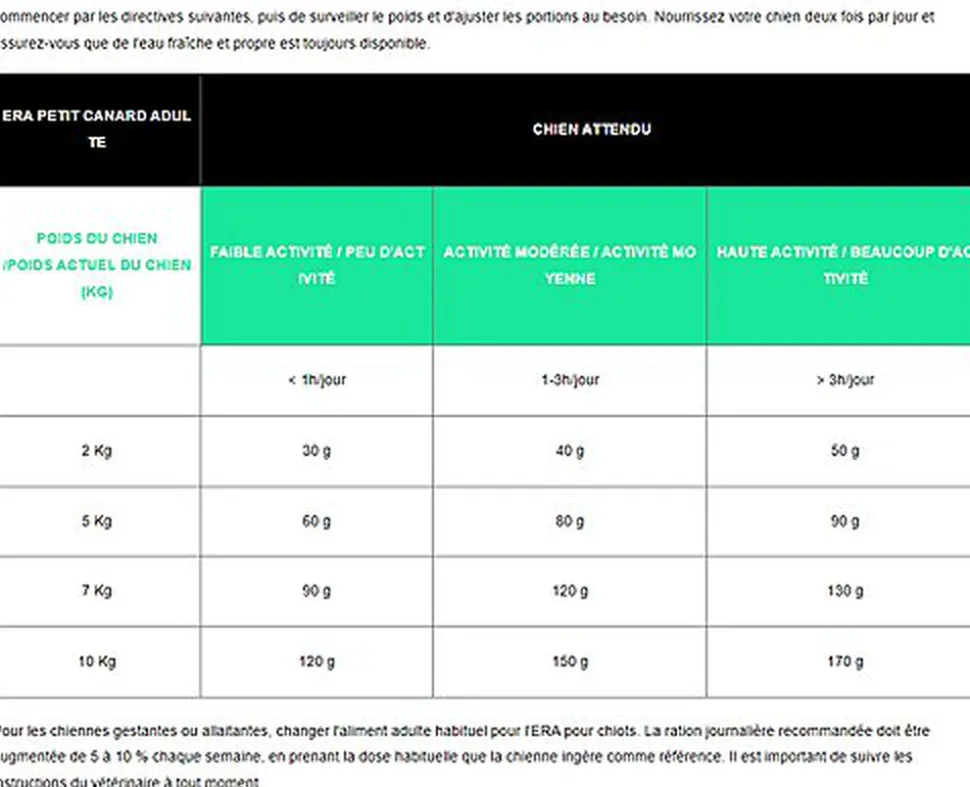 | Composition | Viande de canard fraîche (22 %), protéine de agneau déshydratée (20 %), riz complet (13 %), graisse de poulet (8 %, conservée avec des tocophérols naturels), pois jaunes (6 %), protéine de poulet déshydratée (5 %), pulpe de pomme déshydratée (5 %), patates douces (5 %), hydrolysat de foie de poulet (3 %), protéine de pois (3 %), huile de saumon (2 %), graines de lin (2 %), pulpe de betterave déshydratée (2 %), épinards déshydratés (0,5 %), carottes déshydratées (0,5 %), citrouille (0,5 %), caroube déshydratée (0,5 %), pulpe de tomate (0,5 %), algues marines déshydratées (Ascophyllum nodosum, 0,4 %), carbonate de calcium (0,363 %), grenade déshydratée (0,2 %), myrtilles déshydratées (0,2 %), canneberges déshydratées (0,2 %), glucosamine (0,026 %), levures (source de mannan-oligosaccharides, 0,02 %), extrait d’agrumes (0,02 %), sulfate de chondroïtine (0,016 %), racine de chicorée (source de fructo-oligosaccharides, 0,01 %), yucca Mojave (0,01 %), calendula déshydratée (0,01 %), moule aux lèvres vertes (0,005 %), graines de chardon-Marie déshydratées (0,005 %), échinacée déshydratée (Echinacea purpurea, 0,005 %), thym déshydraté (0,005 %), romarin déshydraté (0,005 %). |