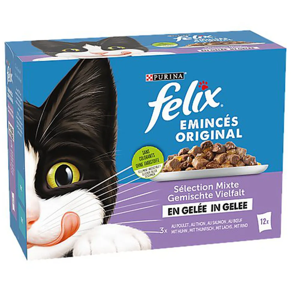 Les chats futés savent ce qu’ils veulent, en particulier à l’heure des repas ! C’est pourquoi les recettes irrésistibles de FELIX® Emincés sont préparées avec des ingrédients de qualité et contiennent de tendres émincés enrobés d’une délicieuse gelée. Ces repas FELIX® Emincés sont une source d’acides gras essentiels Oméga 6 avec le juste équilibre de vitamines pour aider votre chat à rester en pleine forme et à être prêt pour encore plus de malice ! Ils sont préparés avec des ingrédients de qualité pour satisfaire 100% des besoins quotidiens de votre chat, selon les rations journalières recommandées sur l’emballage. Et ce n’est pas tout ! Les repas FELIX® sont disponibles dans une large gamme de recettes en gelée pour satisfaire les envies de variété de votre chat. FELIX®, tellement irrésistible !