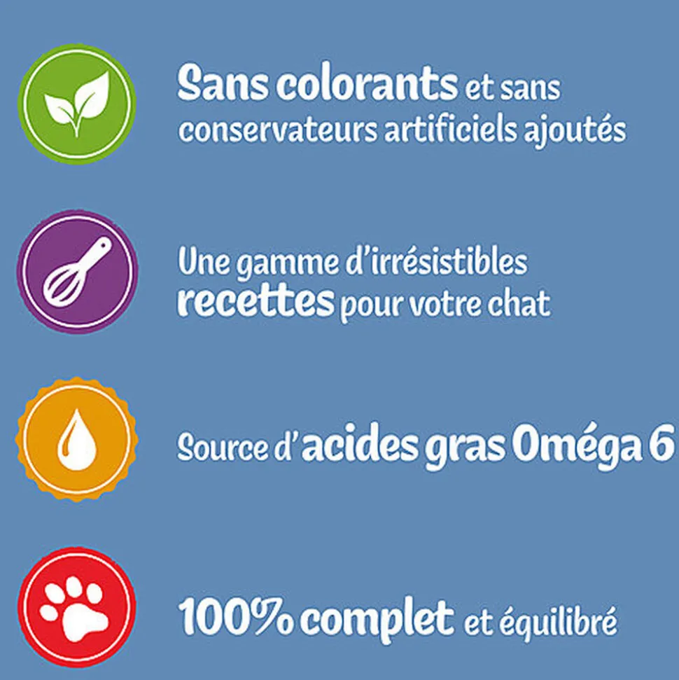 | Composition | Bœuf : Viandes et sous-produits animaux (dont bœuf 4%), Poissons et sous-produits de poissons, Substances minérales, Sucres.Thon : Viandes et sous-produits animaux, Poissons et sous-produits de poissons (thon 4%), Substances minérales, Sucres.Saumon : Viandes et sous-produits animaux, Poissons et sous-produits de poissons (saumon 4%), Substances minérales, Sucres.Poulet : Viandes et sous-produits animaux (dont poulet 8%), Poissons et sous-produits de poissons, Substances minérales, Sucres. |