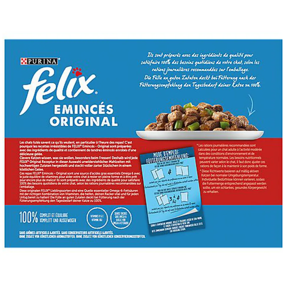 Les chats futés savent ce qu’ils veulent, en particulier à l’heure des repas ! C’est pourquoi les recettes irrésistibles de FELIX® Emincés sont préparées avec des ingrédients de qualité et contiennent de tendres émincés enrobés d’une délicieuse gelée. Ces repas FELIX® Emincés sont une source d’acides gras essentiels Oméga 6 avec le juste équilibre de vitamines pour aider votre chat à rester en pleine forme et à être prêt pour encore plus de malice ! Ils sont préparés avec des ingrédients de qualité pour satisfaire 100% des besoins quotidiens de votre chat, selon les rations journalières recommandées sur l’emballage. Et ce n’est pas tout ! Les repas FELIX® sont disponibles dans une large gamme de recettes en gelée pour satisfaire les envies de variété de votre chat. FELIX®, tellement irrésistible !