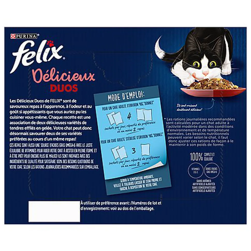 Les Délicieux Duos de FELIX® sont de savoureux repas à l’apparence, à l’odeur et au goût si appétissants que vous auriez pu les cuisiner vous-même. Chaque recette est une association de deux délicieuses variétés de tendres effilés en gelée. Votre chat peut donc désormais savourer deux de ses variétés préférées au cours d’un même repas ! Ces repas sont aussi une source d’acides gras Oméga-6 avec le juste équilibre de vitamines pour aider votre chat à rester en pleine forme et à être prêt pour encore plus de malice ! Ils sont préparés avec des ingrédients de qualité pour satisfaire 100% des besoins quotidiens de votre chat, selon les rations journalières recommandées sur l’emballage.Et ce n’est pas tout ! Les Délicieux Duos de FELIX® sont disponibles dans une large gamme de délicieuses recettes en gelée pour satisfaire les envies de variété de votre chat.Ils sont vraiment doublement délicieux ! FELIX®, tellement irrésistible !