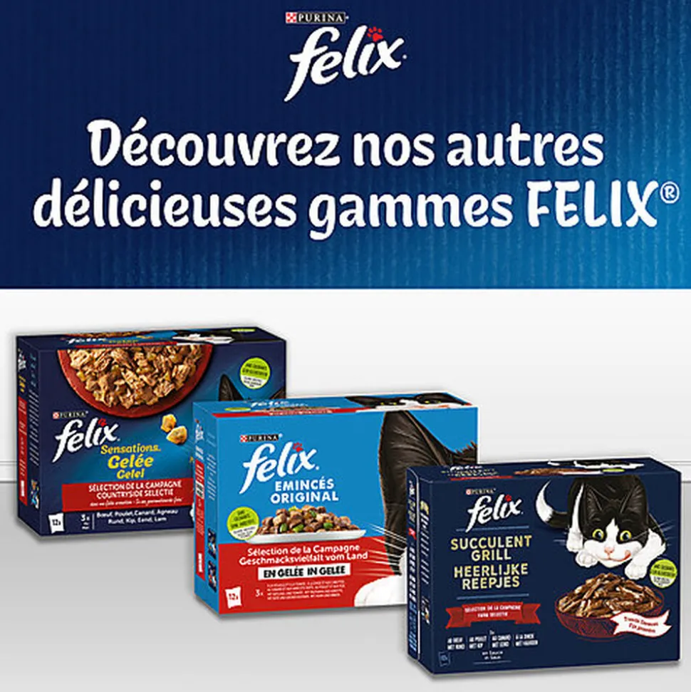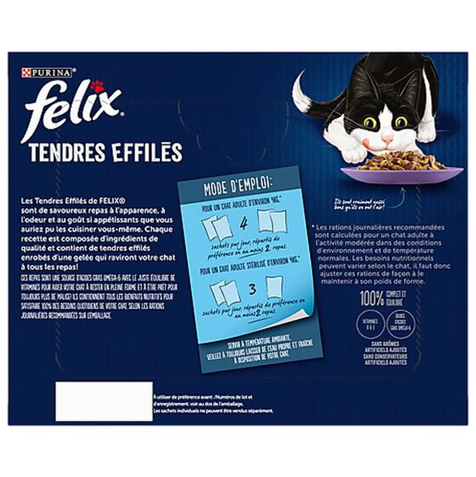 Les Tendres Effilés de FELIX® sont de savoureux repas à l’apparence, à l’odeur et au goût si appétissants que vous auriez pu les cuisiner vous-même. Chaque recette est composée d’ingrédients de qualité et contient de tendres effilés enrobés d’une gelée qui raviront votre chat à tous les repas ! Ces repas sont une source d’acides gras Oméga-6 avec le juste équilibre de vitamines pour aider votre chat à rester en pleine forme et à être prêt pour toujours plus de malice ! Ils contiennent tous les bienfaits nutritifs pour satisfaire 100% des besoins quotidiens de votre chat, selon les rations journalières recommandées sur l’emballage. Et ce n’est pas tout ! Les Tendres Effilés de FELIX® sont disponibles dans une large gamme de délicieuses recettes en gelée pour satisfaire les envies de variété de votre chat. Ils sont vraiment aussi bons qu’ils en ont l’air ! FELIX®, tellement irrésistible !