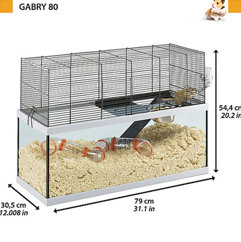 Les habitats à deux étages Gabry Ferplast sont spécialement conçus pour abriter plusieurs gerbilles en toute sécurité. Les cages Gabry sont formées sur la partie inférieure d’une cuve en verre robuste recouverte d’une cage en grillage métallique peinte avec une porte d’entrée avec une serrure de sécurité. La cuve en verre, spacieuse et profonde, est parfaite pour être remplie de sciure de bois, dans laquelle l’animal aime particulièrement creuser des tunnels et se cacher. Les habitats pour gerbilles Gabry sont équipés d’accessoires : à l’intérieur vous trouverez une échelle reliant les deux étages, un abreuvoir, une mangeoire pour la nourriture en acier placée sur l’étage en métal et un ensemble de tubes pour le jeu. Gabry est extrêmement facile à nettoyer puisque le dessus en métal peut être complètement détaché de la cuve en verre: de cette façon, vous pouvez nettoyer soigneusement même les endroits les plus sâles et les plus difficiles de la cage. La structure en grillage métallique a également une porte d’ouverture utile sur le côté avant pour l’entretien quotidien.