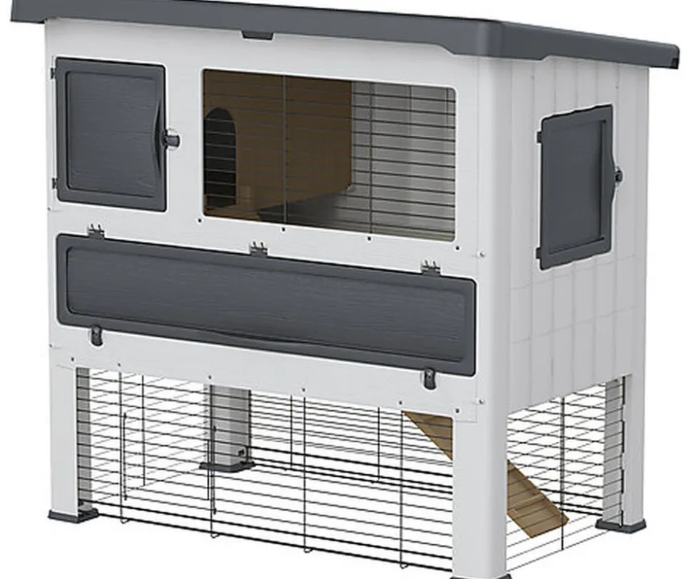 Clapier en plastique recyclé fabriqué dans notre usine en Slovaquie pour lapins. Le design est élégant, le montage et l’entretien facile.
