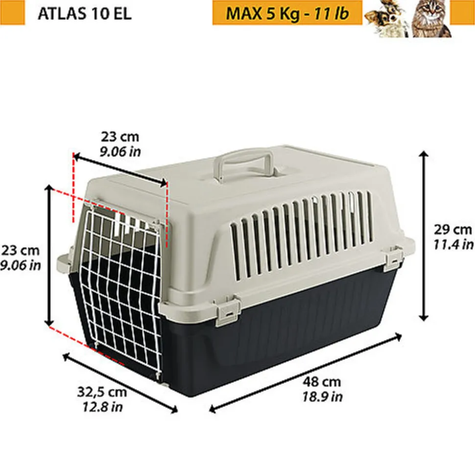 L’Atlas EL est facile à transporter avec vous, grâce à sa poignée fixe et est idéal pour voyager avec vos animaux de compagnie dans les moyens de transport les plus courants (voiture, train, bateau, avion). Ce panier de transport en plastique pour chats et petits chiens est livré avec une porte en fer plastifié. Il est très robuste, grâce à son système de fixation avec pinces à ressort latéral. Il a aussi des grilles d’aération latérales, qui assurent une ventilation suffisante à l’intérieur du panier.