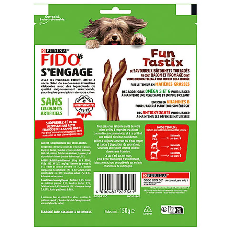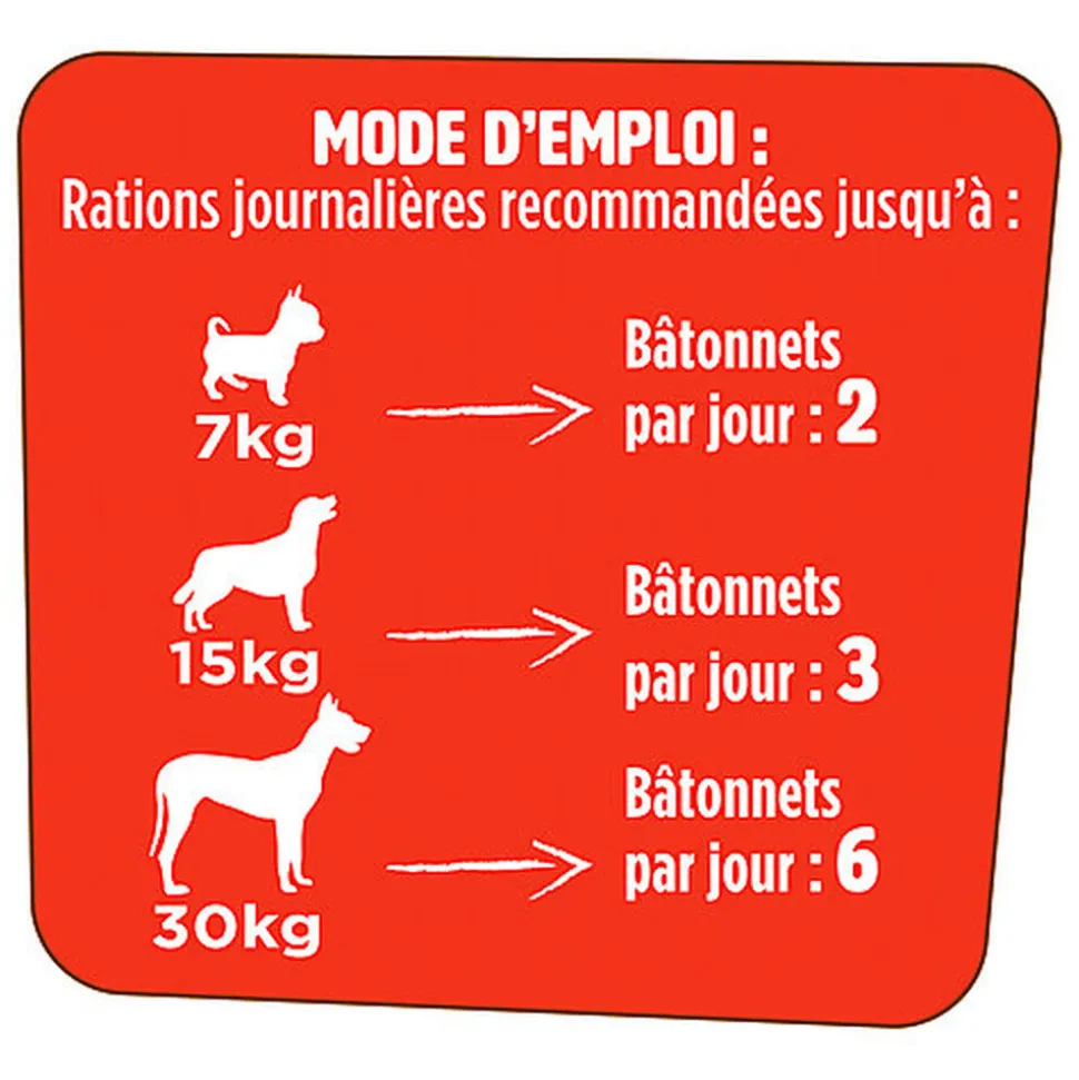 | Directives d’alimentation | Rations journalières recommandées jusqu’à : Poids du chien : 7 kg / Bâtonnets par jour : 2 Poids du chien : 15 kg / Bâtonnets par jour : 4 Poids du chien : 30 kg / Bâtonnets par jour : 6. Ajustez en conséquence la ration du repas principal. Veillez à toujours laisser de l’eau propre et fraîche à disposition de votre chien. Surveillez votre chien lorsque vous lui donnez une friandise. |