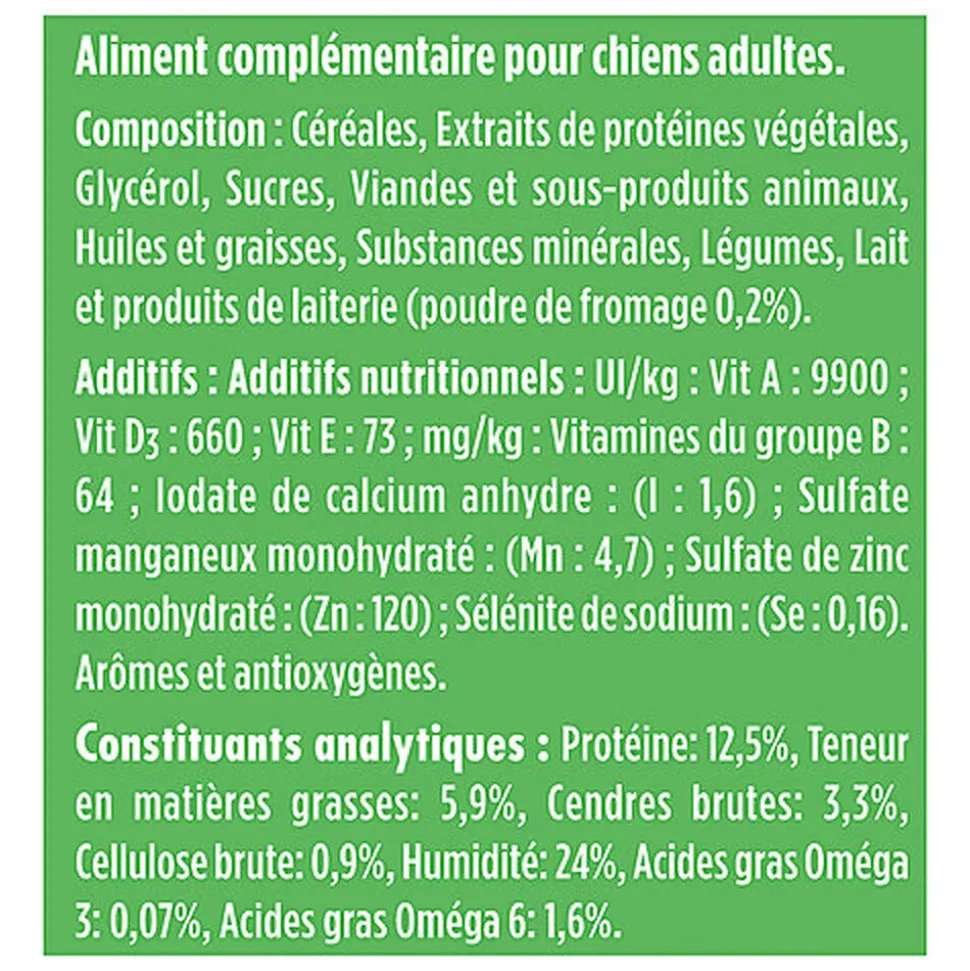 | Composition | Aliment complémentaire pour chiens adultes. Composition :Céréales, extraits de protéines végétales, glycérol, sucres, viandes et sous-produits animaux, huiles et graisses, substances minérales, légumes, lait et produits de laiterie (poudre de fromage (0,2%*). (*équivalent à 1,2% de fromage). Constituants analytiques : Protéine : 13,0%;Teneur en matières grasses : 4,5%;Cendres brutes : 3,3%;Cellulose brute : 0,75%;Humidité : 25,0%;Acides linolénique : 740 mg/kg;Acides linoléique : 12900 mg/kg. |