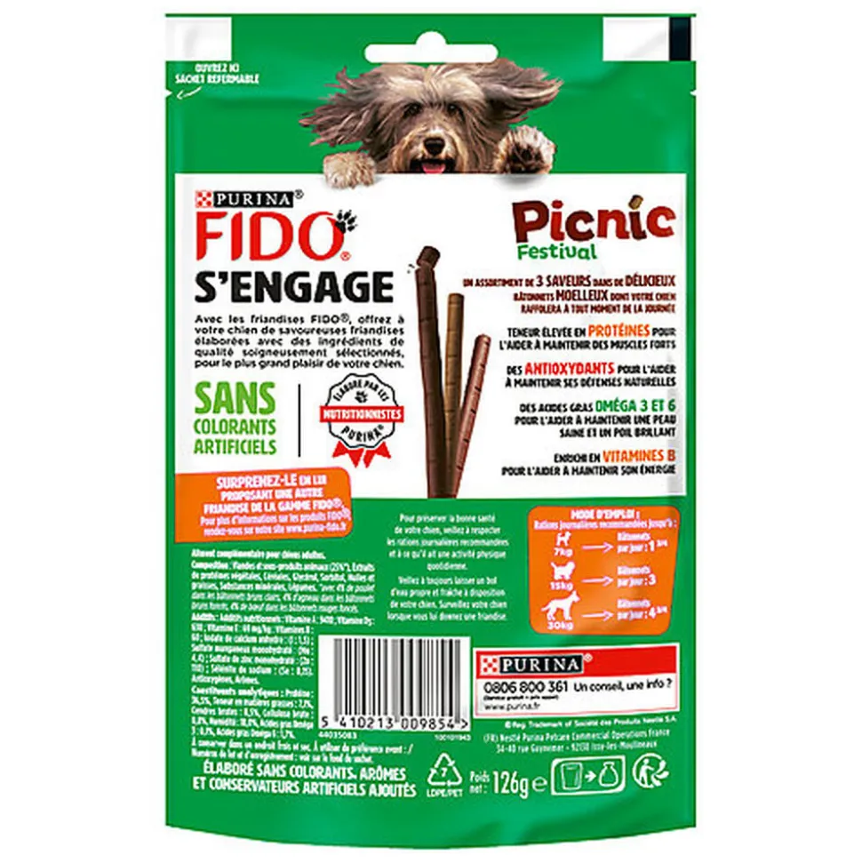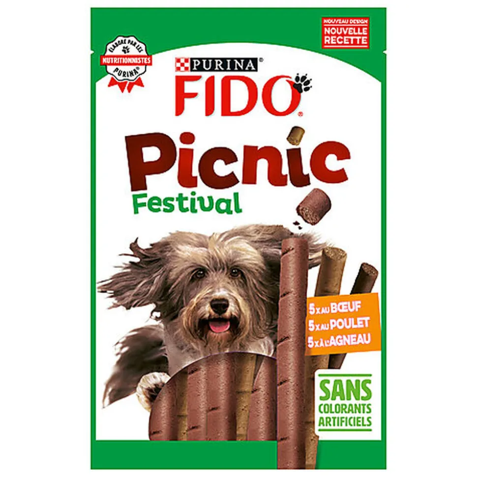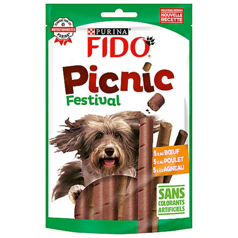 Les bâtonnets Picnic Festival de Fido sont une récompense savoureuse préparée avec beaucoup de viandes et sont spécialement adaptés à votre compagnon. En effet, pour gâter votre compagnon, il vaut mieux éviter de lui faire grignoter vos propres en-cas. Il faut privilégier les snacks et autres friandises élaborées spécialement pour lui.
