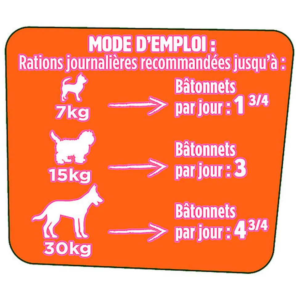 | Directives d’alimentation | Rations journalières recommandées jusqu’à :Poids du chien: 7 kg / Bâtonnets par jour : 2 Poids du chien: 15 kg / Bâtonnets par jour : 4 Poids du chien: 30 kg / Bâtonnets par jour : 6.Ajustez en conséquence la ration du repas principal.Veillez à toujours laisser de l’eau propre et fraîche à dispositon de votre chien.Surveillez votre chien lorsque vous lui donnez une friandise. |