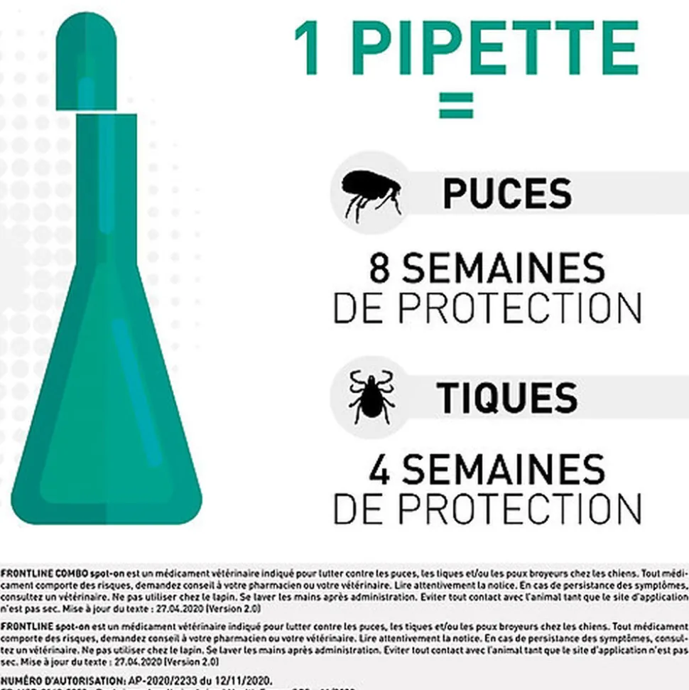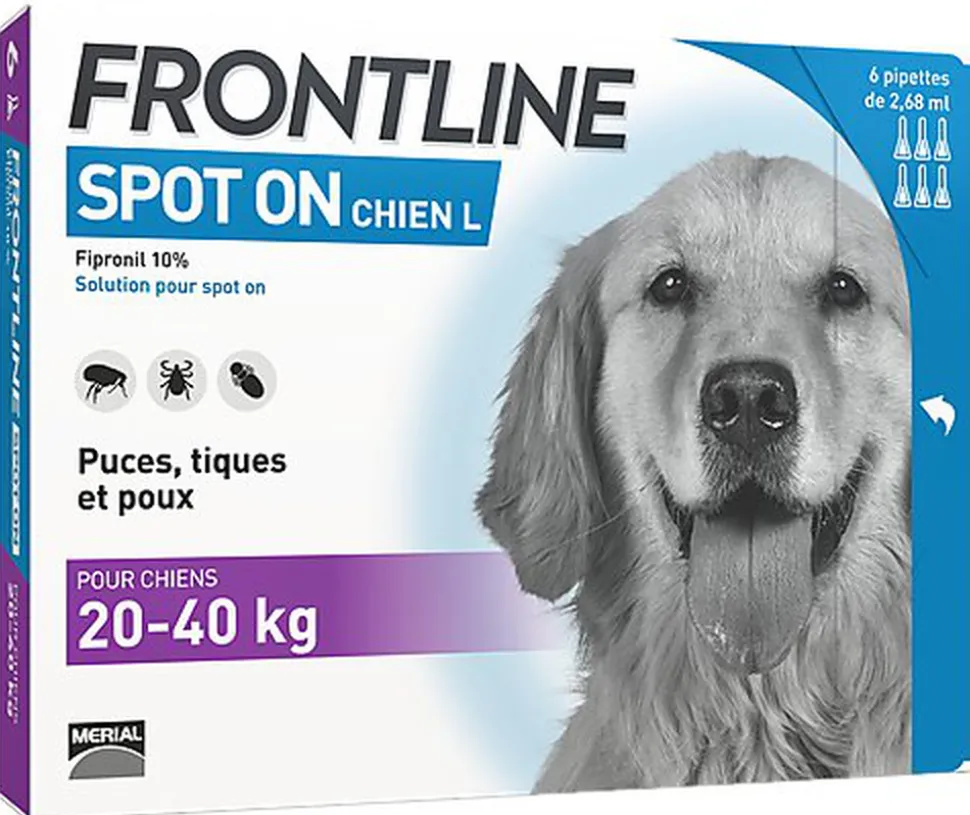 Les pipettes Frontline Spot-On sont aussi efficaces que la version spray mais plus faciles d’utilisation. En moins de 24h, votre chien est protégé contre les puces et les tiques ! Les chiots peuvent être traités avec Frontline Spot-On (dès 8 semaines), ainsi que les chiennes en gestation ou en lactation.