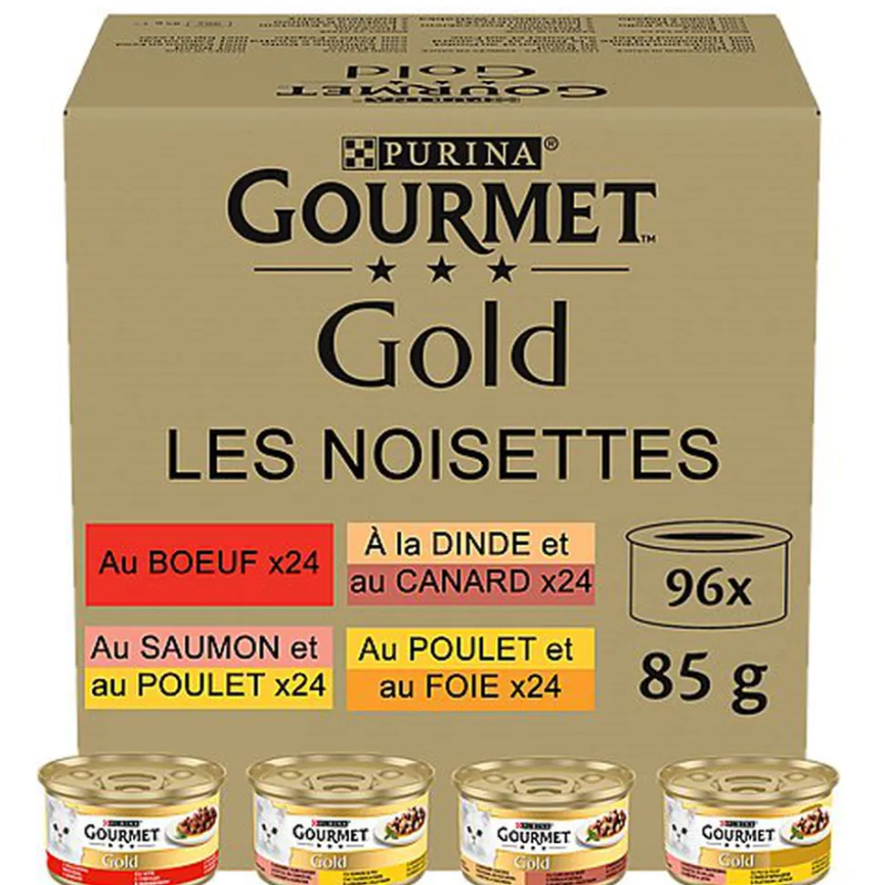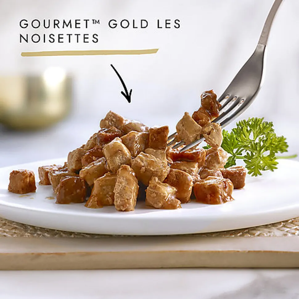 GOURMET™ GOLD Les Noisettes sont de tendres bouchées au bœuf, au poulet, au saumon ou d’autres succulentes saveurs, mijotés à la perfection. Le tout est nappé d’une appétissante sauce pour offrir à votre chat le plaisir d’une saveur riche en goût. Toutes les recettes GOURMET™ GOLD sont élaborées avec des ingrédients de haute qualité et sont sans colorants ajoutés, sans arômes artificiels ajoutés et sans conservateurs artificiels ajoutés.