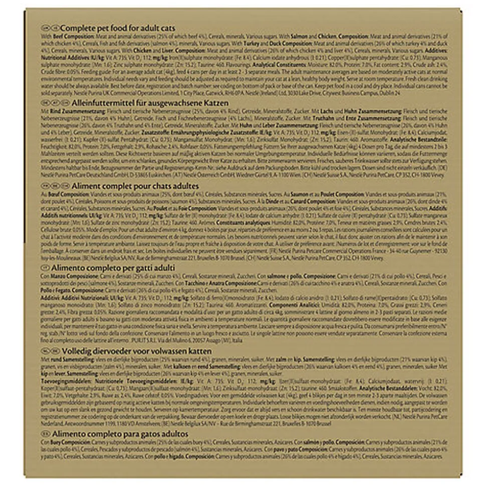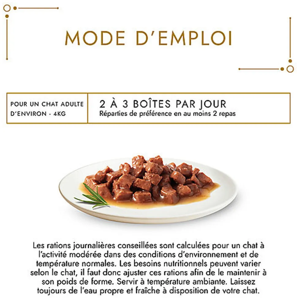| Directives d’alimentation | Pour un chat adulte d’environ 4 kg, donnez 4 boîtes par jour, réparties de préférence en au moins 2 ou 3 repas. Les rations journalières conseillées sont calculées pour un chat à l’activité modérée dans des conditions d’environnement et de température normales. Les besoins nutritionnels peuvent varier selon le chat, il faut donc ajuster ces rations afin de le maintenir à son poids de forme. Servir à température ambiante. |