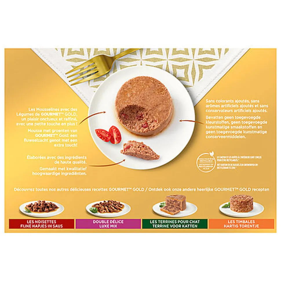Vous savez que votre chat raffole des mousselines et vous aimeriez le surprendre avec un choix encore plus large de saveurs pour satisfaire son palais délicat. GOURMET Gold a donc créé Les Mousselines avec des Légumes, de délicieuses mousses accompagnées de légumes sélectionnés, soigneusement préparées pour offrir à votre chat le plaisir d’une délicate sensation de raffinement. Les Mousselines avec des Légumes de GOURMET® Gold, un plaisir onctueux et raffiné, avec une petite touche en plus !