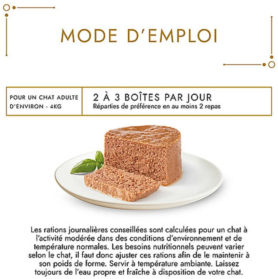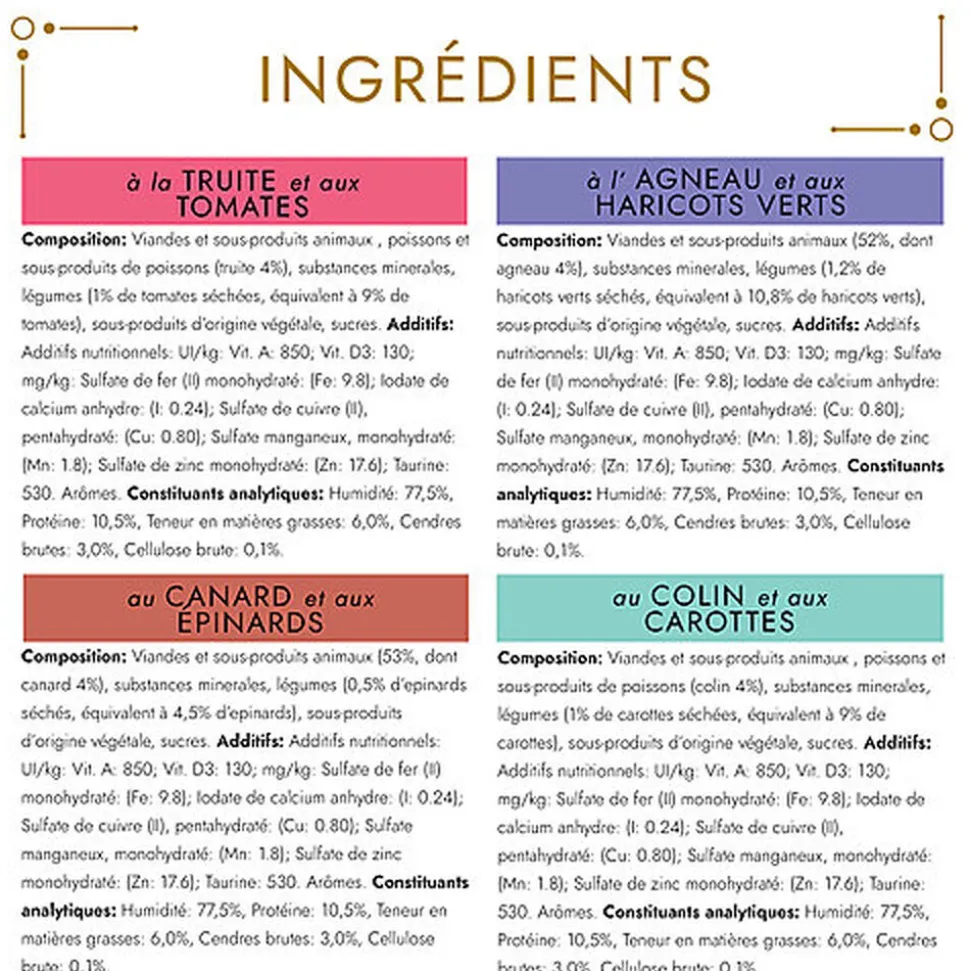 | Composition | A l’Agneau avec de délicieux Haricots verts :Viandes et sous-produits animaux (dont agneau 4 %), substances minérales, légumes (1,2 % de haricots verts déshydratés, équivalent à 10,8 % de haricots verts), sous-produits d’origine végétale, sucres. .Au Canard avec une touche d’Épinards :Viandes et sous-produits animaux (dont canard 4 %), substances minérales, sous-produits d’origine végétale, légumes (0,5 % d’épinards déshydratés, équivalent à 4,5 % d’épinards), sucres.A la Truite avec de savoureuses Tomates :Viandes et sous-produits animaux, poissons et sous-produits de poissons (dont truite 4 %), substances minérales, légumes (1 % de tomates déshydratées, équivalent à 9 % de tomates), sous-produits d’origine végétale, sucres.Au Colin avec de délicates Carottes :Viandes et sous-produits animaux, poissons et sous-produits de poissons (dont colin 4 %), substances minérales, légumes (1 % de carottes déshydratées, équivalent à 9 % de carottes), sous-produits d’origine végétale, sucres. |