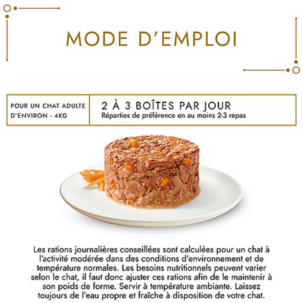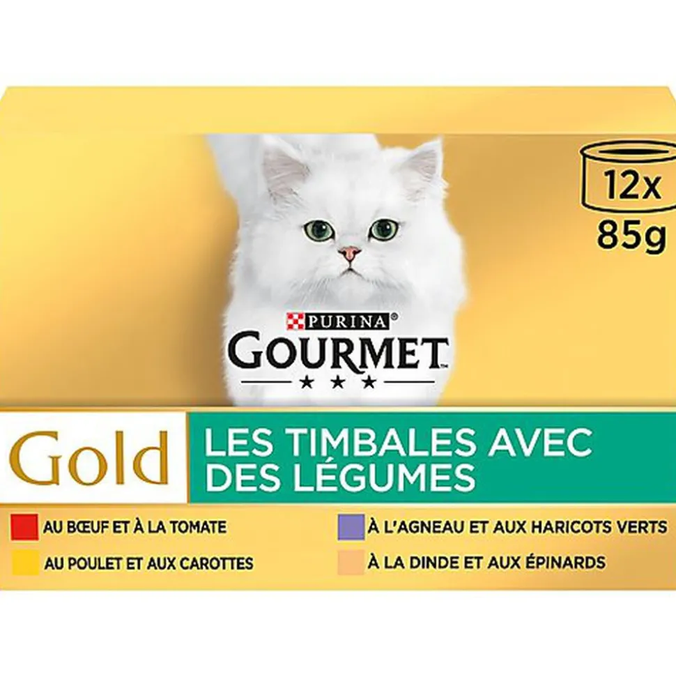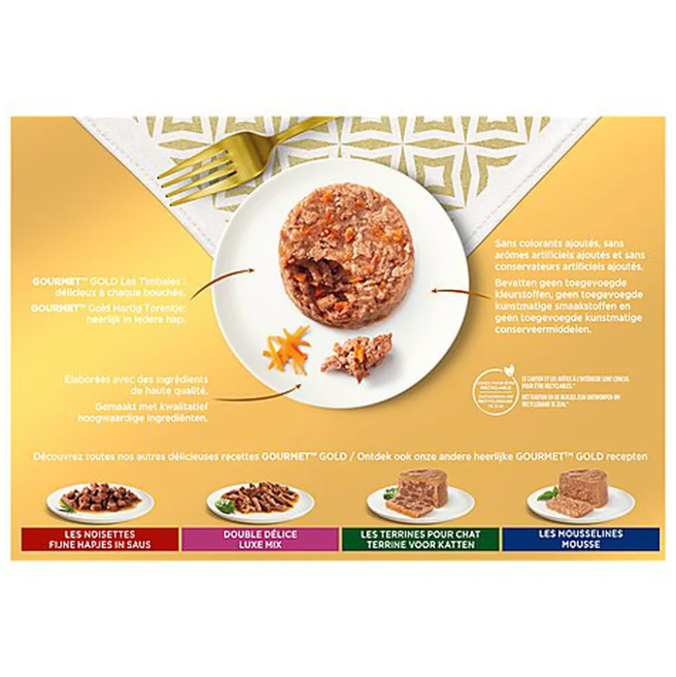 Vous ne voulez pas que votre chat se lasse de ses repas et vous souhaitez le surprendre en lui proposant de nouvelles textures pour ravir son palais. GOURMET™ GOLD a donc créé Les Timbales, une délicieuse gamme développée avec des ingrédients de haute qualité, et une texture présentée en timbales, pour offrir à votre chat une expérience culinaire dont il se délectera. GOURMET™ GOLD Les Timbales, de délicieuses et fines bouchées d’émincés au bœuf, au poulet ou autres succulentes saveurs, délicatement assaisonnées avec un soupçon de sauce. Une combinaison présentée en exquise timbale pour que votre chat puisse en savourer chaque bouchée. GOURMET™ GOLD Les Timbales : délicieux à chaque bouchée. Toutes les recettes GOURMET™ GOLD sont élaborées sans colorants ajoutés, sans conservateurs artificiels ajoutés et sans arômes artificiels ajoutés.