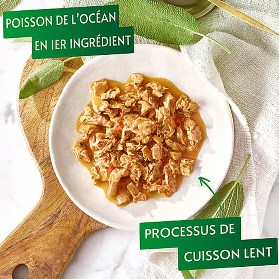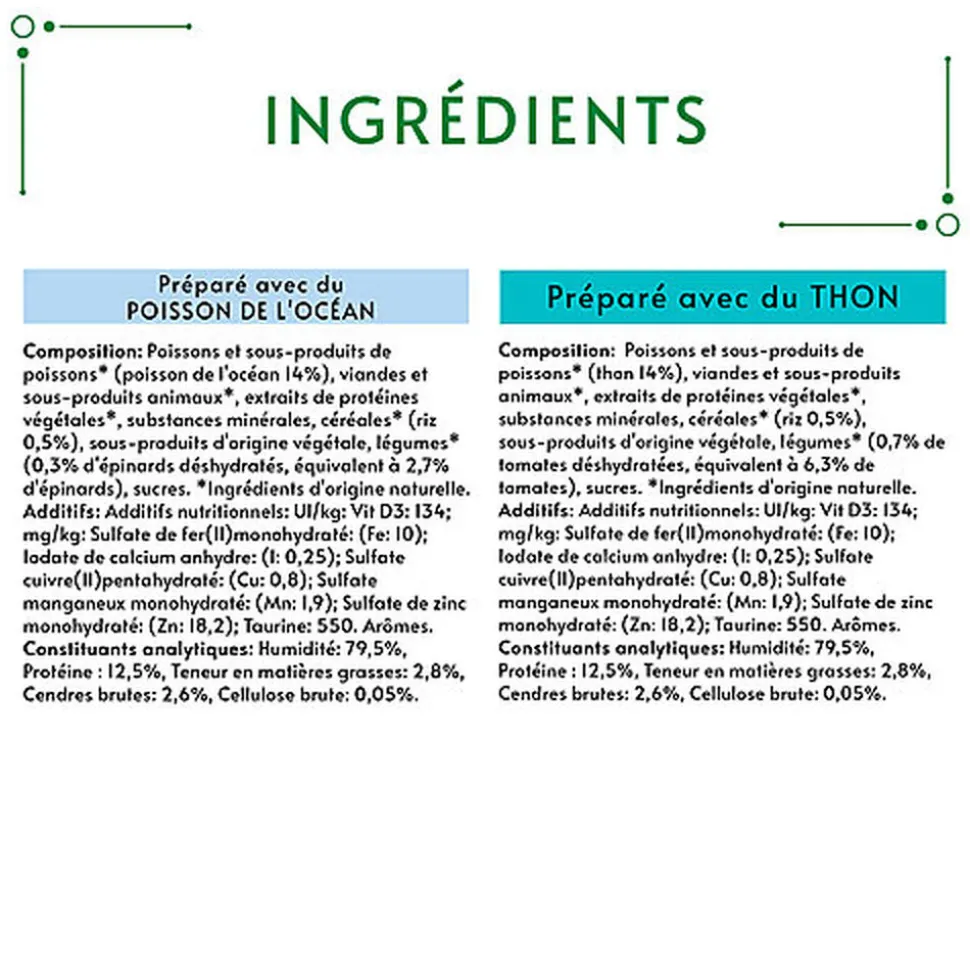 | Composition | Composition recette Poisson de l’Océan: Poissons et sous-produits de poissons* (poisson de l’océan 14%), Viandes et sous-produits animaux*, Extraits de protéines végétales*, Substances minérales, Céréales* (riz 0,5%), Sous-produits d’origine végétale, Légumes* (0,3% d’épinards séchés, équivalent à 2,7% d’épinards), Sucres. *Ingrédients d’origine naturelle.Composition recette au Thon : Poissons et sous-produits de poissons* (thon 14%), Viandes et sous-produits animaux*, Extraits de protéines végétales*, Légumes* (0,7% de tomates séchées, équivalent à 6,3% de tomates), Substances minérales, Céréales* (riz 0,5%), Sous-produits d’origine végétale, Sucres. *Ingrédients d’origine naturelle. |