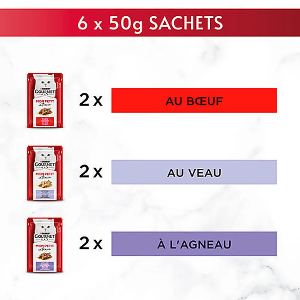 Pour les fins connaisseurs, tout est une question d’intensité des saveurs. GOURMET™ MON PETIT Intense. Une collection raffinée de délicieuses recettes qui célèbrent l’essence même du goût. Nous avons sélectionné des ingrédients de haute qualité et lentement cuit de délicats émincés dans une délicieuse sauce afin d’en extraire toute l’intensité de leurs saveurs. Votre chat fin connaisseur adorera nos petites portions fraîchement servies à chaque repas, pour une expérience gustative unique. Facile à ouvrir, facile à servir, sans gaspillage et dans un sachet conçu pour être recyclable. Toutes nos délicieuses recettes sont 100% complètes et équilibrées pour des chats adultes.