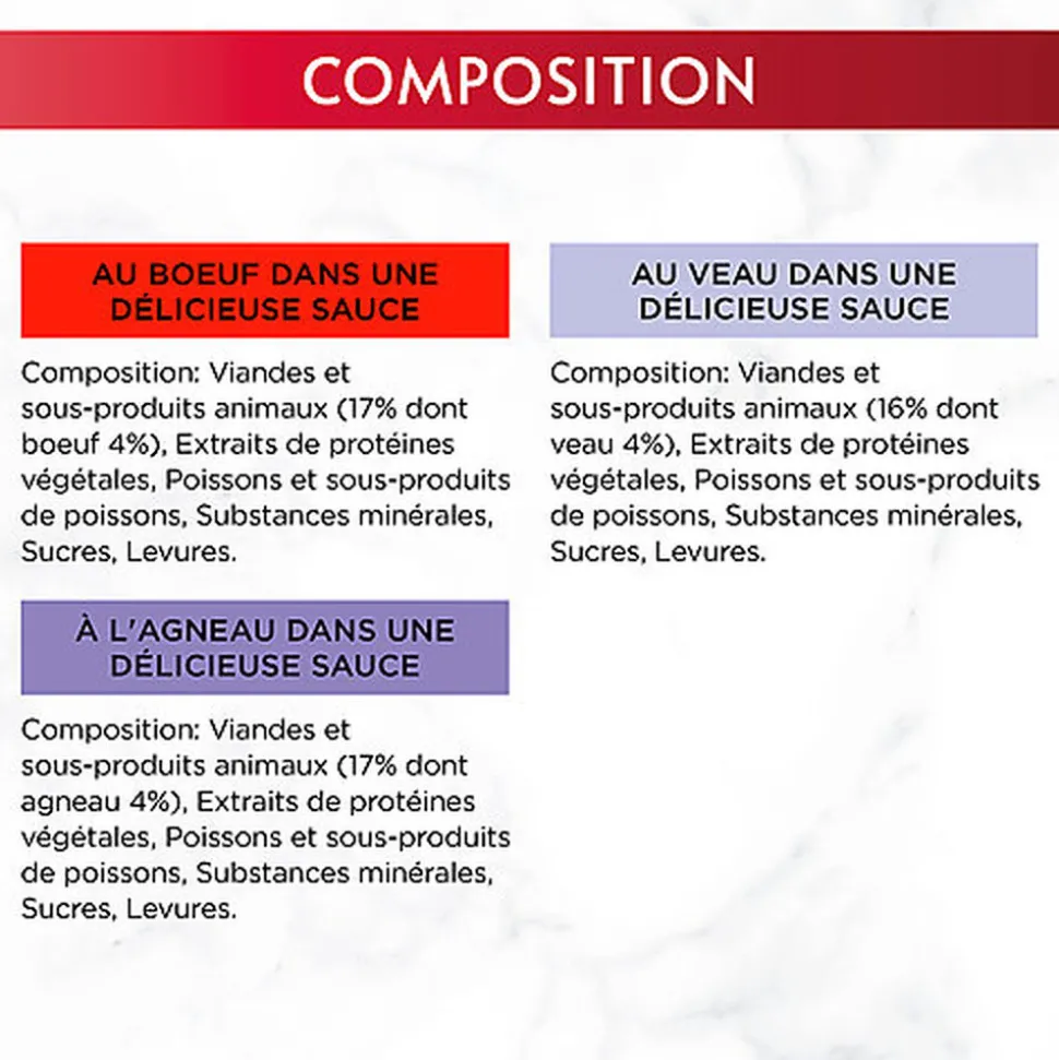 | Composition | Bœuf :Viandes et sous-produits animaux (17% dont bœuf 4%), Extraits de protéines végétales, Poissons et sous-produits de poissons, Substances minérales, Sucres, Levures.Veau :Viandes et sous-produits animaux (16% dont veau 4%), Extraits de protéines végétales, Poissons et sous-produits de poissons, Substances minérales, Sucres, Levures.Agneau :Viandes et sous-produits animaux (17% dont agneau 4%), Extraits de protéines végétales, Poissons et sous-produits de poissons, Substances minérales, Sucres, Levures. |