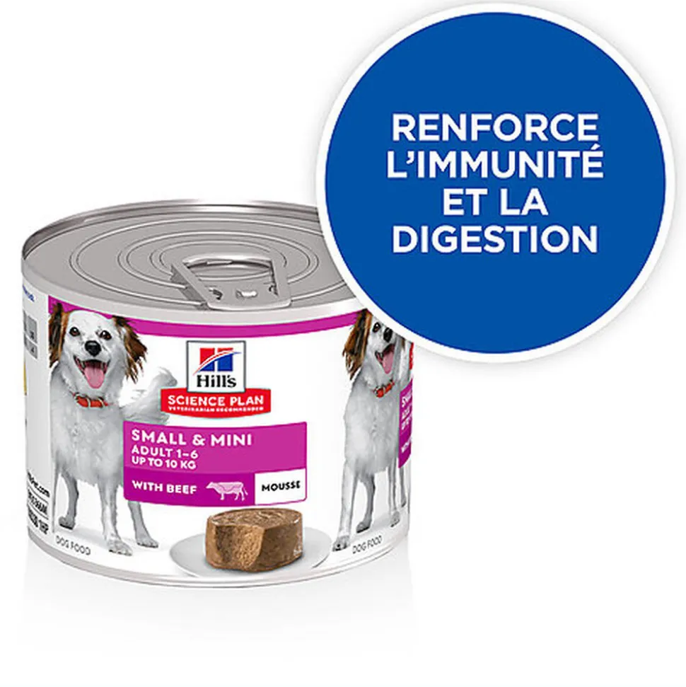 Hill’s Science Plan Small & Mini – Mousse pour Chien Adulte – Petites et Très Petites Races au Bœuf est un aliment complet à la texture fondante pour les chiens adultes de petite taille âgés de 1 à 6 ans. Cette alimentation est adaptée aux besoins uniques de votre petit chien pendant la période la plus active de sa vie.