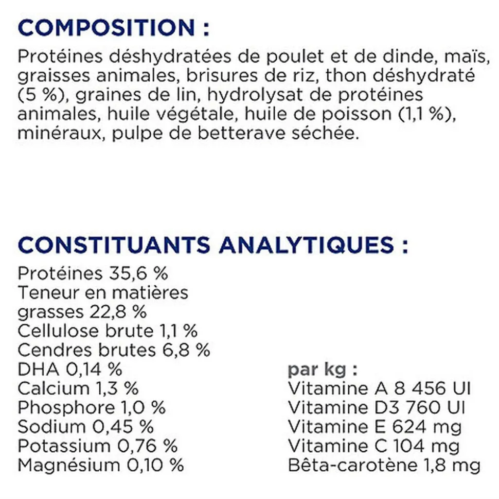 | Composition | Thon : Protéines déshydratées de poulet et dinde, maïs, graisse animale, protéines déshydratées de thon (5%), farine de gluten de maïs, hydrolysat, graines de lin, minéraux, pulpe de betterave déshydratée, huile de poisson, huile de soja, vitamines, taurine, oligo-éléments et bêta-carotène. Avec un antioxydant naturel (mélange de tocophérols) |