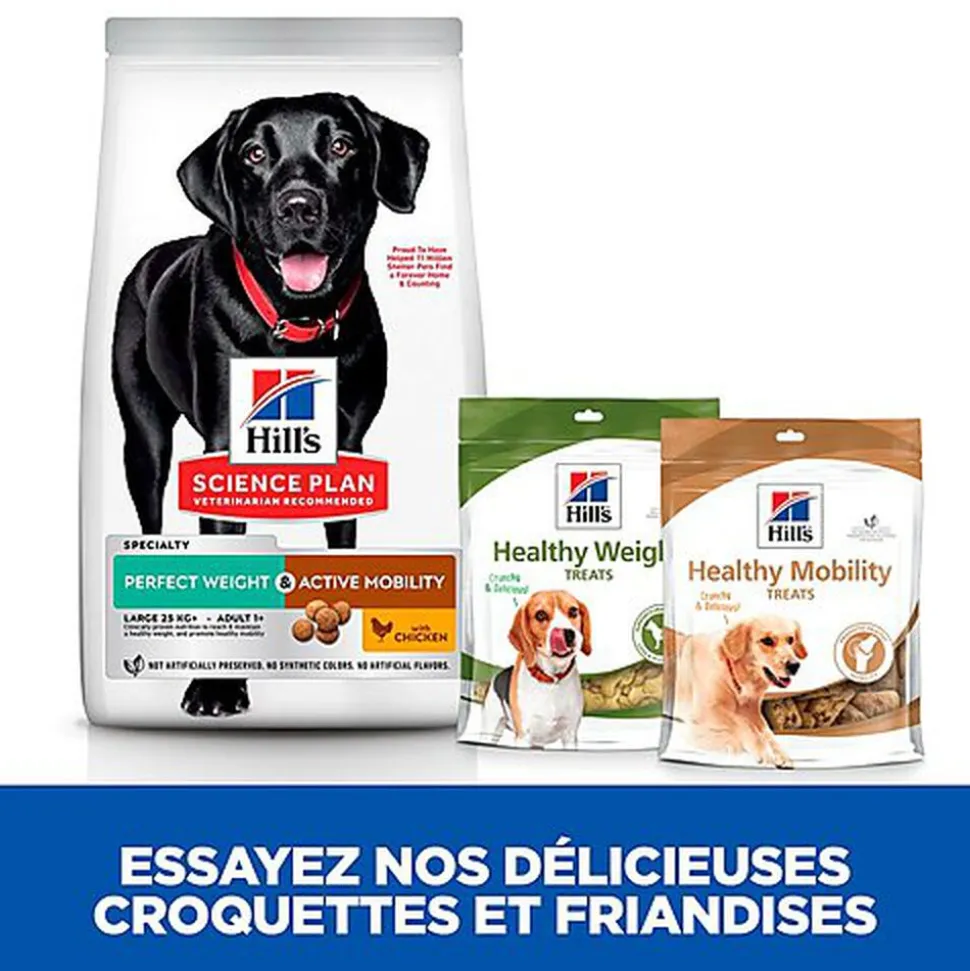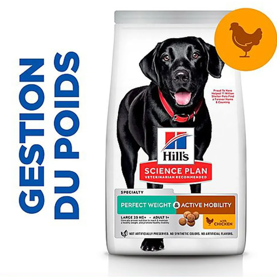 HILL’S SCIENCE PLAN Perfect Weight + Active Mobility aliment pour Chiens Adultes de grande race au Poulet, est une nutrition délicieuse, cliniquement prouvée pour atteindre et maintenir un poids de forme et soutenir la fonction articulaire pour une vie active et une bonne mobilité.